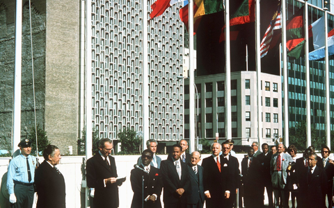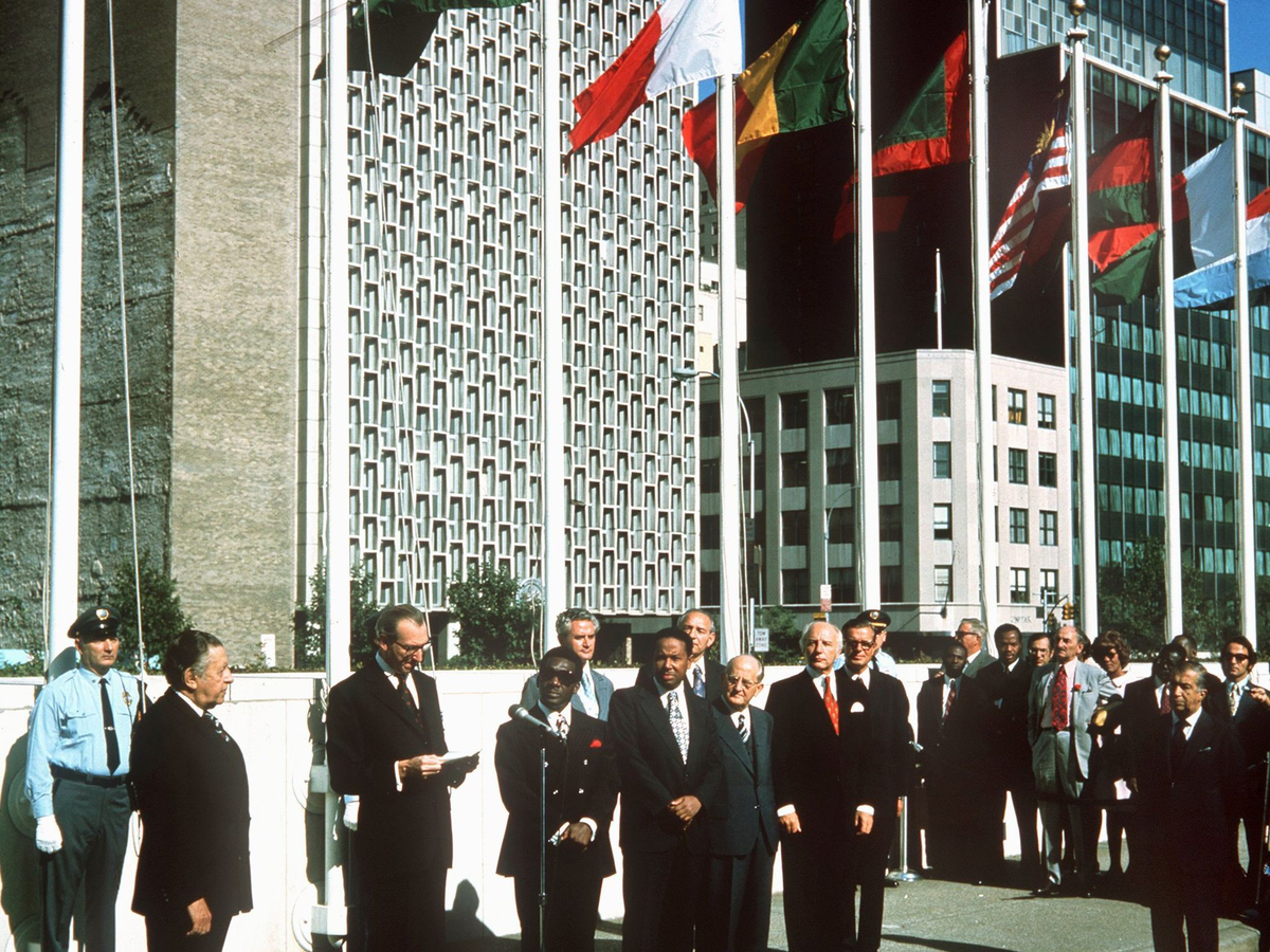 Als Deutschland am 18. September 1973 um 17.43 Uhr Ortszeit als neuestes Mitglied der Vereinten Nationen von der Vollversammlung bestätigt wurde, nahmen die Diplomaten in der Kuppelhalle am New Yorker East River an zwei Tischen nebeneinander Platz.