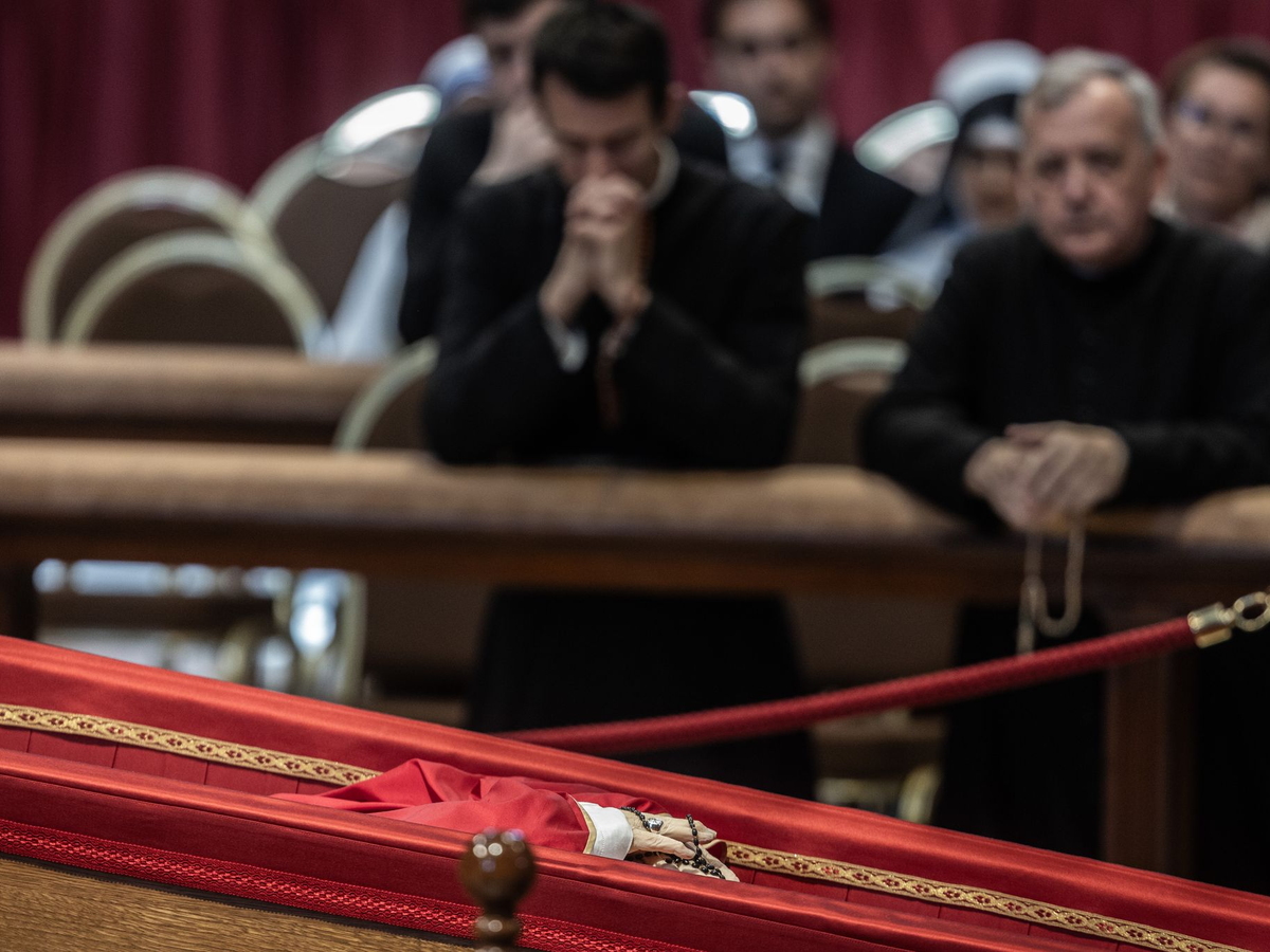 Noch zu Lebzeiten hatte Franziskus angeordnet, dass die Rituale der katholischen Kirche nach dem Tod eines Papstes weniger pompös ablaufen sollen. Im Petersdom liegt sein Leichnam - anders als etwa der emeritierte Papst Benedikt XVI. im Januar 2023 - nicht frei auf einem Katafalk zu sehen, also einer hohen Bahre. Franziskus ruht in einem Holzsarg, in rotem Gewand und mit weißer Kopfbedeckung. Um die Hände wurde ihm ein Rosenkranz geschlungen.