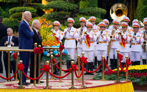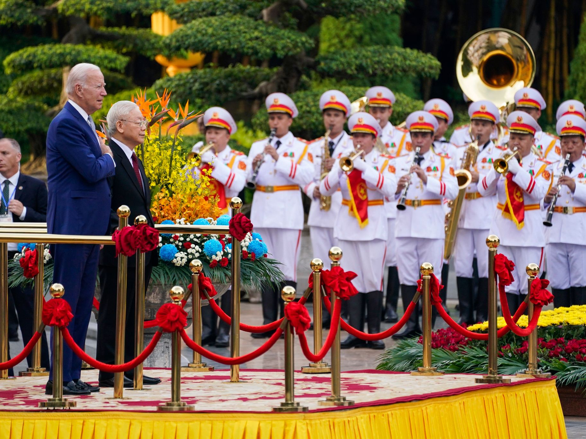 Generalsekretär Nguyen Phu Trong empfing Biden in der Parteizentrale und sagte der mitreisenden Presse zufolge, dass Vietnam «ein Freund, ein zuverlässiger Partner und ein verantwortungsvolles Mitglied der internationalen Gemeinschaft» sei. Er scherzte außerdem und machte dem 80-jährigen Biden ein Kompliment: «Sie sind nicht einen Tag gealtert, und ich würde sagen, Sie sehen sogar noch besser aus als früher.» Einen nicht ganz so fitten Eindruck machte Biden kurze Zeit später bei einer Pressekonferenz, zu der er mit großer Verspätung kam und sich mehrfach versprach.