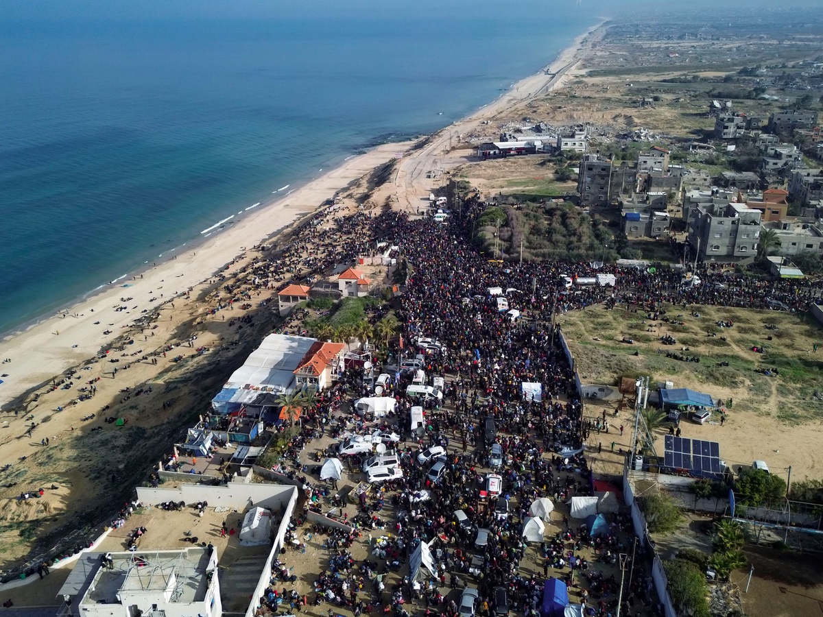 Im Gegenzug erlaubte Israel ab 7.00 Uhr Ortszeit (6.00 Uhr MEZ) die RĂŒckkehr vertriebener palĂ€stinensischer Zivilisten aus dem SĂŒden in ihre Heimatorte im Norden des verwĂŒsteten KĂŒstengebiets. Kurz darauf zeigten Aufnahmen in palĂ€stinensischen sozialen Medien Tausende von PalĂ€stinenser, die sich auf einer ausgewiesenen Route von der SĂŒdseite des vom israelischen MilitĂ€r angelegten Netzarim-Korridors zu FuĂ auf den Weg in den Norden machten.