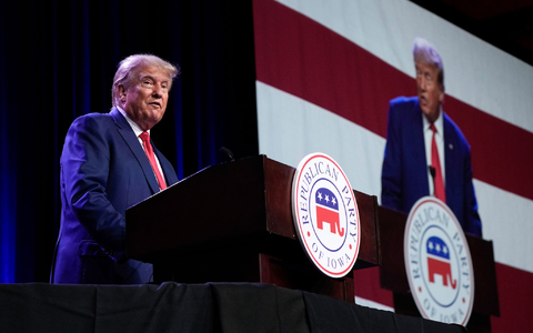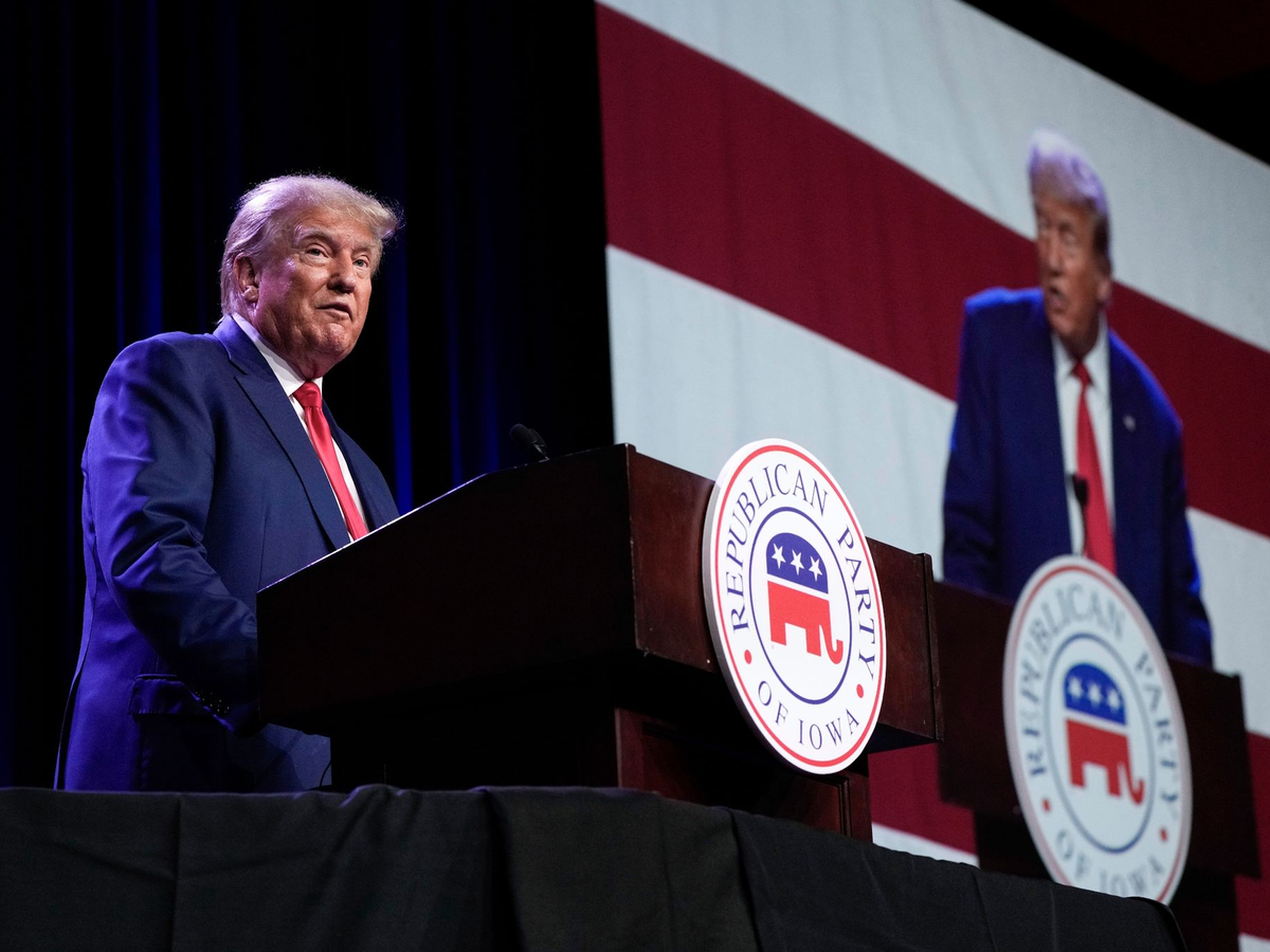 • Der ehemalige US-Präsident Donald Trump spricht beim Lincoln Dinner 2023 der Republikanischen Partei von Iowa. - Foto: Charlie Neibergall/AP