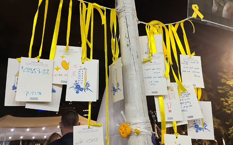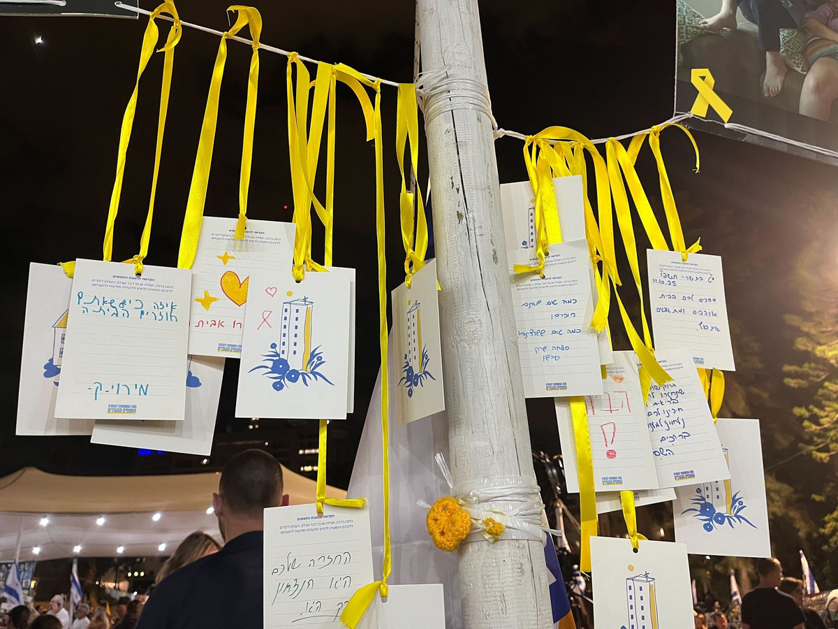 Auf dem Platz der Geiseln hängen an gelben Bändern Hunderte von Briefen, die Bürger den Geiseln geschrieben haben. «Was für eine Freude, dass Ihr wieder nach Hause kommt», steht in krakeliger Kinderschrift in einem davon.