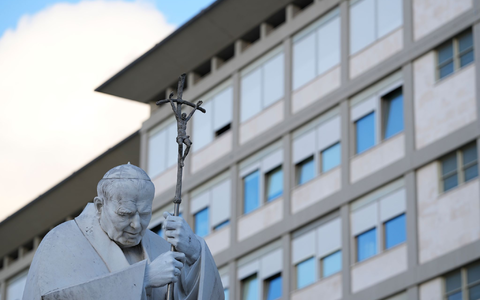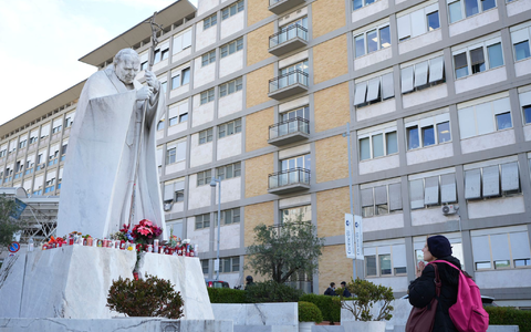 Vor der Gemelli-Klinik in Rom versammeln sich täglich besorgte Gläubige - sie beten und halten inne vor einer Statue von Franziskus' Vorvorgänger Papst Johannes Paul II. Die Menschen legen dort Kerzen sowie Blumen ab.