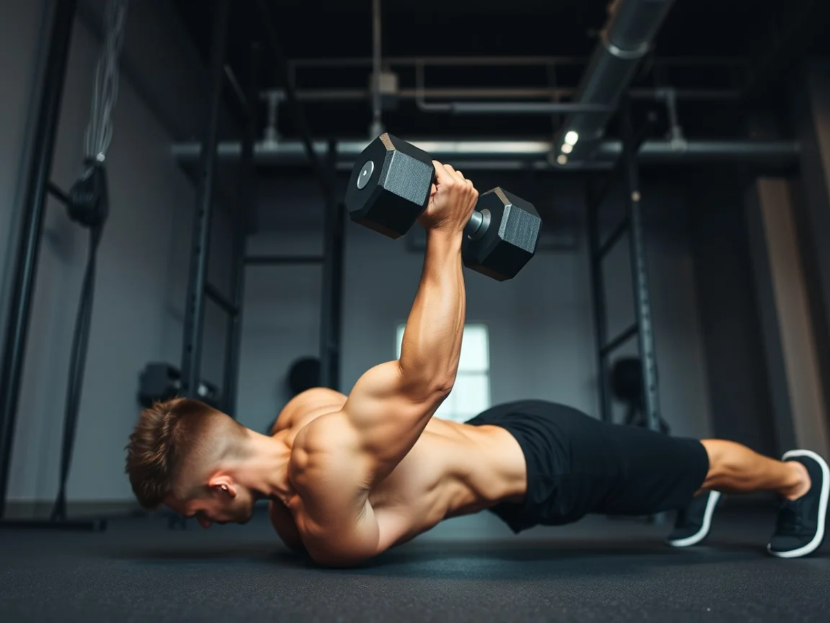 Der Clou liegt in der doppelten Herausforderung. Während ein Arm die Hantel zieht, muss der gesamte Rumpf gegen die Rotation arbeiten. Bauch- und seitliche Muskeln stabilisieren den Körper in der Plank-Haltung.