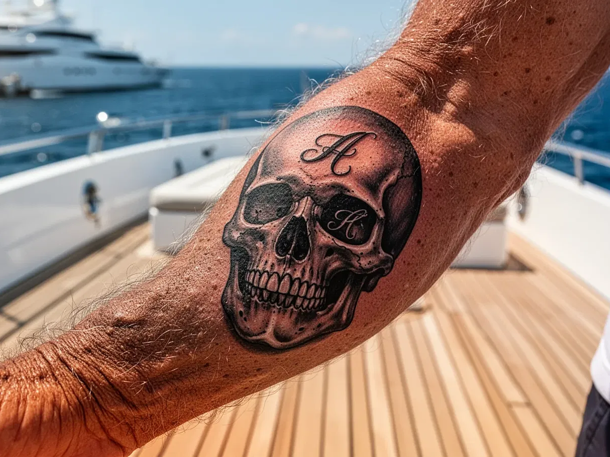 Das großflächige Motiv ziert nun seinen rechten Unterarm. Im Zentrum steht ein Totenkopf, angelehnt an das Logo seiner Modemarke „Roberto Geissini“. Eingearbeitet sind die Buchstaben „C“ für Carmen, „D“ für Davina und „S“ für Shania. Aus einem rockigen Symbol wurde so ein persönliches Familien-Denkmal.