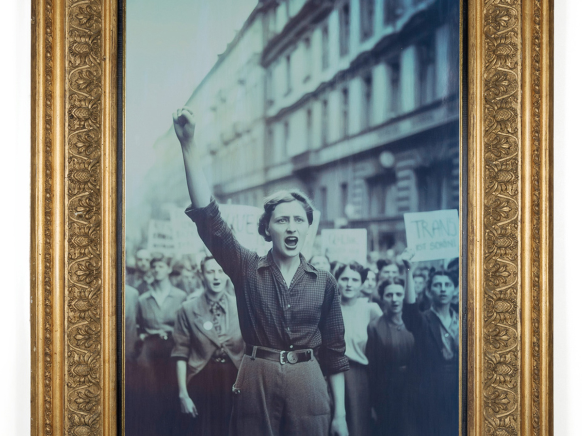 Die partizipative Wandinstallation "Studio Supplement" der in Wien lebenden Ku?nstlerin Marlene Fröhlich etwa ist speziell fu?r die Schau entstanden. Die vielen kleinen Schwarz-Weiß-Fotos an der Wand wirken wie einem alten Familienalbum entnommen, sind jedoch KI-generierte und anschließend aufwendig analog ausgearbeitete Bilder. Sie stellen sich einer heteronormativen Vorstellung von Freundschaft und Liebe entgegen und regen dazu an, u?ber die Macht der Bilder nachzudenken, auch u?ber die Notwendigkeit, alternative Narrative zu entwickeln. Die Arbeit ist selbst einem ständigen Veränderungsprozess unterworfen: So können Besucher:innen in einem an der Wand montierten Briefkasten Wu?nsche fu?r Bilder von Freundschaft hinterlassen, die ihnen in der Geschichte und Gegenwart fehlen; ausgewählte Beispiele werden dann von der Ku?nstlerin anstelle von anderen in die Installation integriert.