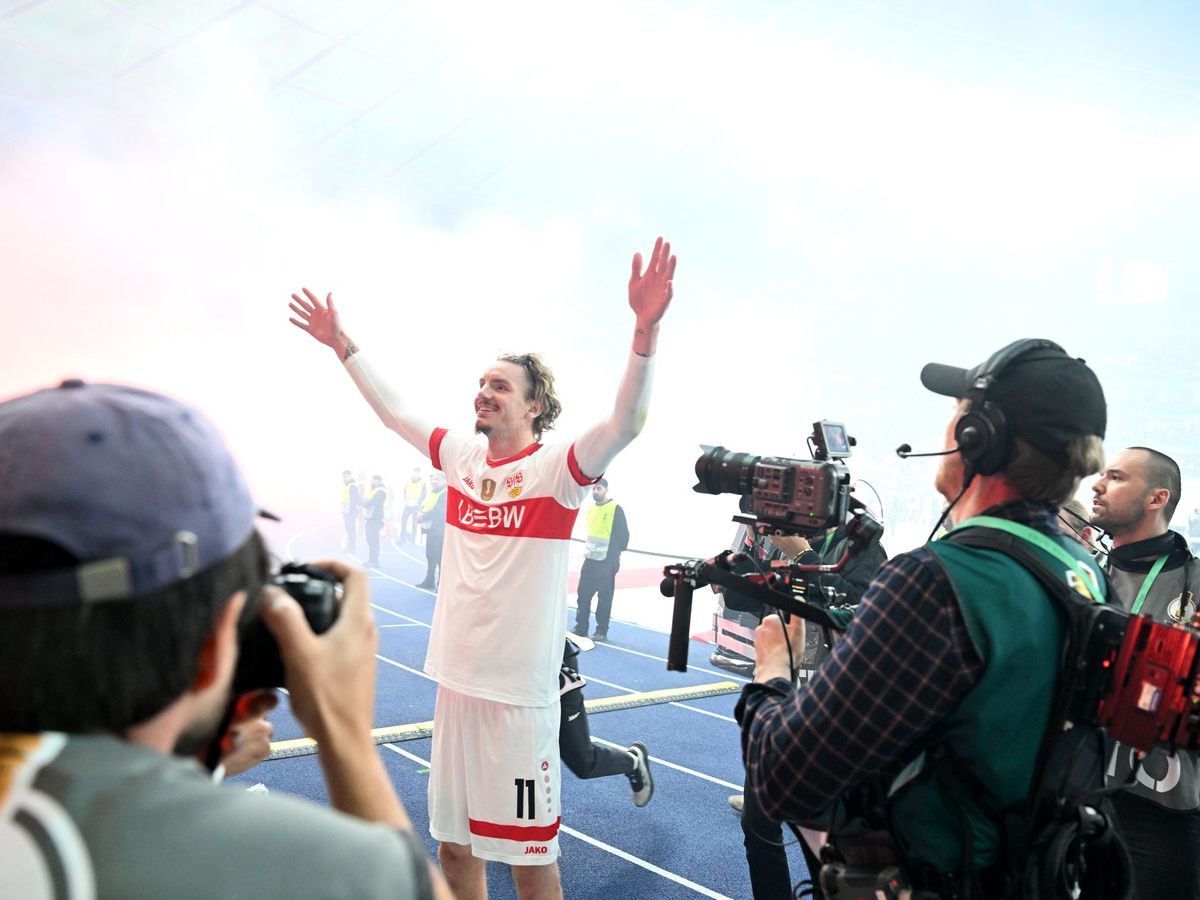 Während auf der Trophäe der Vereinsname der Schwaben eingraviert wurde, ließen aber auch die Bielefelder Fans ihre Spieler noch einmal für den sensationellen Lauf bis ins Finale hochleben. Selbst der Gegner zollte größten Respekt. Woltemade ging umgehend zu den Spielern. Er habe ihnen zur Leistung und zur ganzen Saison gratuliert, berichtete der erstmals in den Nationalmannschaftskader berufene Woltemade. «Ich finde, das gehört sich so.»
