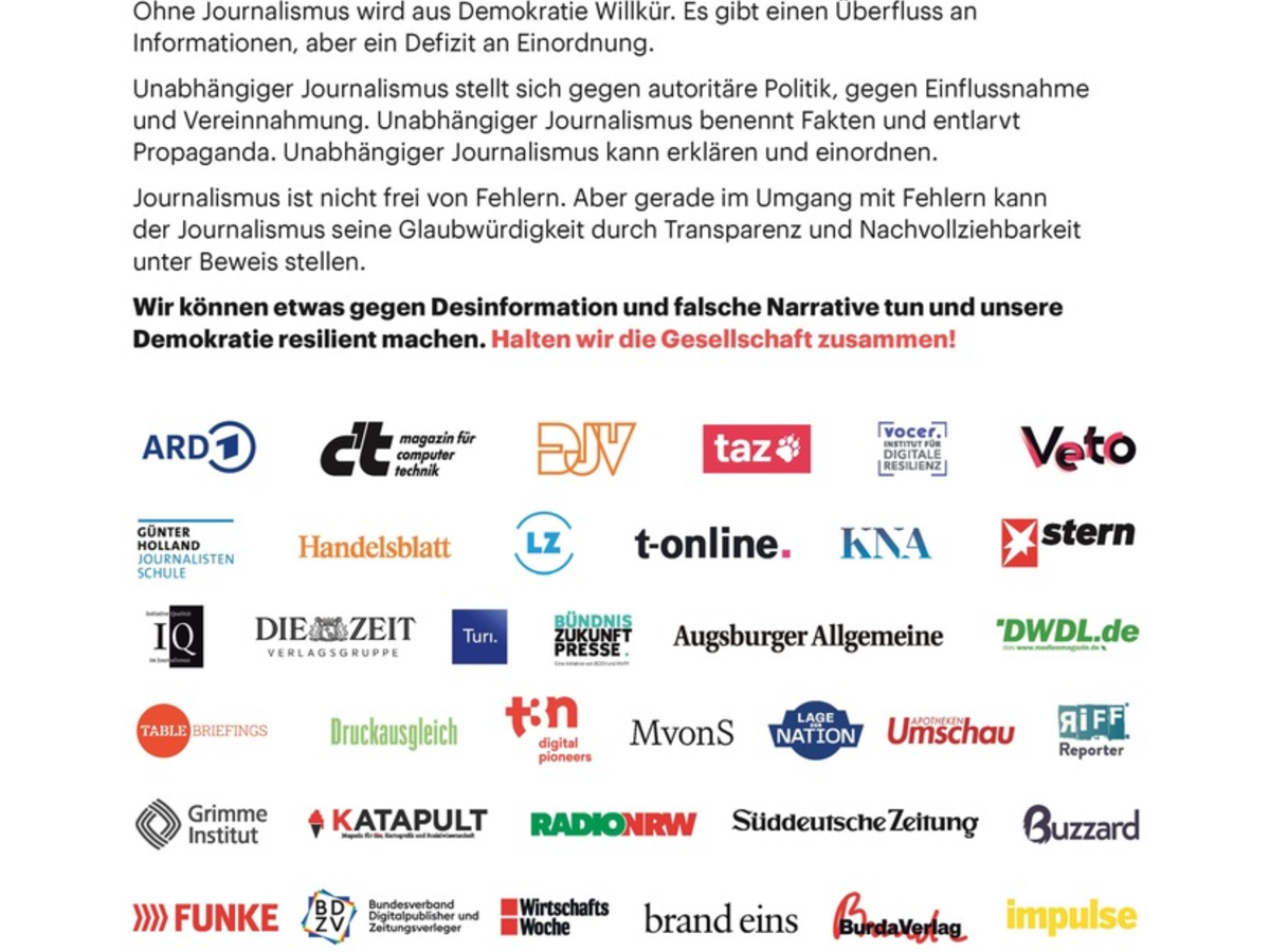 Hinter der Kampagne stehen: absatzwirtschaft, Apotheken Umschau, ARD, Augsburger Allgemeine, BDZV, brand eins, Bündnis Zukunft Presse, Burda Verlag, Buzzard, c't, Correctiv, Die Zeit Verlagsgruppe, dfv Mediengruppe, DJV, Druckausgleich, DWDL.de, Funke, Grimme-Institut, Günter Holland Journalistenschule, Handelsblatt, Hostwriter, impulse, Initiative Qualität, Lage der Nation, Katapult, Kicker, KNA, Landeszeitung für die Lüneburger Heide, MVFP, MvonS, Netzwerk Recherche, Radio NRW, Reporter ohne Grenzen, Riffreporter, RUMS, stern, Süddeutsche Zeitung, t3n, Table Briefings, taz, t-online, Turi, Veto, Vocer Institut für digitale Resilienz, volo-werden.de, Weser-Kurier, WirtschaftsWoche.