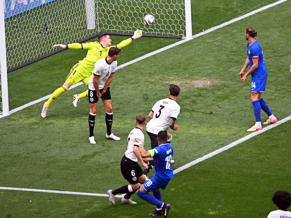 Der deutsche Chancen-Wucher rächte sich gegen die immer wieder schnell konternden Franzosen. Nach einer Hereingabe seines Real-Madrid-Kollegen Aurelien Tchouameni versetzte Mbappé im Kapitäns-Duell Joshua Kimmich mit einem Haken und traf in die lange Ecke. Marc-André ter Stegen, der zuvor zweimal ganz stark gehalten hatte, war auch da mit der Hand noch am Ball.