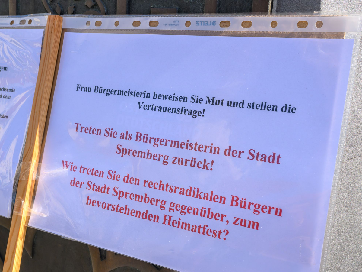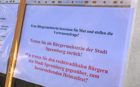 Kritik an Herntier ist schon am Vormittag auf dem Marktplatz zu hören, wo sich eine kleine Gruppe Protestierender versammelt hat. Einige fordern den Rücktritt Herntiers. Auch hier heißt es, die Bürgermeisterin habe dem Ansehen geschadet. «Als Bürger der Stadt Spremberg fühle ich mich mit ihren Auftritten in die rechtsradikale Schiene gedrückt.»