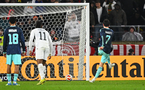 Als Havertz kurz darauf eine schöne Kombination erfolgreich veränderte, zählte der Treffer nicht, weil Woltemade bei seiner Ablage knapp im Abseits stand. Der Video-Assistent griff auch ein, als Angelo Stiller bei seinem Schuss den abgespreizten Arm des für den VfL Wolfsburg spielenden Verteidigers Jonas Adjetey traf. Nachträglich gab es Elfmeter, Havertz trat an und traf.