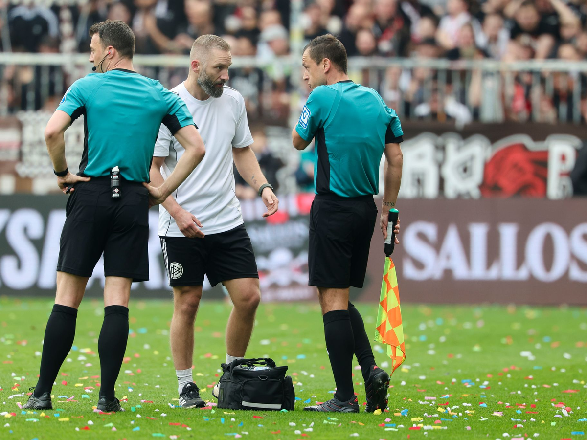 Kurz vor der Pause kam es dann auch noch zu einem Rollentausch innerhalb des Schiedsrichter-Teams (41.): Linienrichter Christian Dietz verletzte sich an der Wade, musste behandelt werden und konnte zumindest nicht mehr weiter an der Seitenlinie auf und ab laufen. Nach einer mehrminütigen Unterbrechung übernahm deshalb der 4. Offizielle Eric Weisbach seinen Job - und Dietz stellte sich mit bandagiertem Unterschenkel zumindest bis zur Halbzeit zwischen die beiden Trainerbänke. In der zweiten Hälfte sprang der Schiedsrichter-Beobachter des DFB für ihn ein, der dafür von der Tribüne geholt wurde.