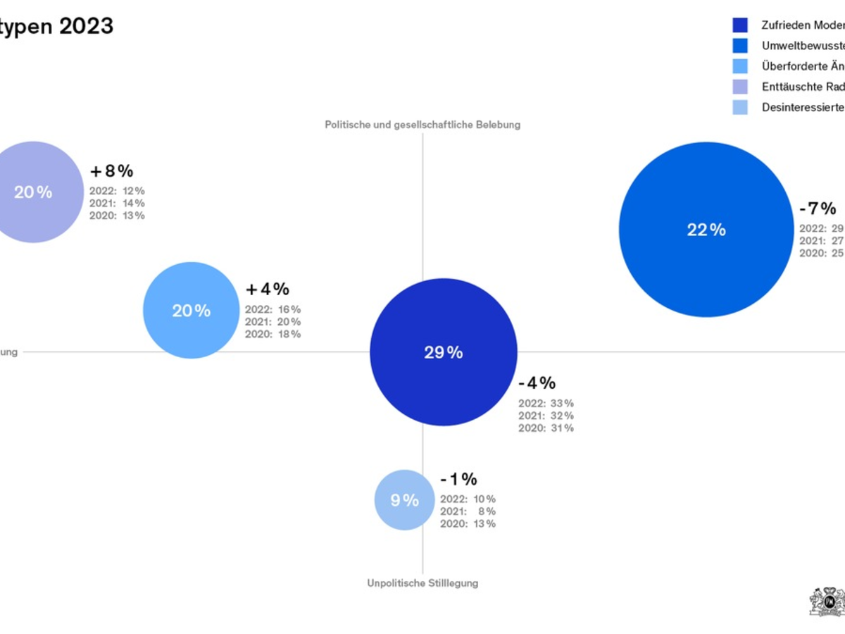 Befragt nach der generellen Demokratiezufriedenheit sowie der Wahrnehmung der eigenen Lebenssituation und der politischen Stimmung in Deutschland, macht die Verteilung der im Rahmen der Studie erhobenen "Erwartungstypen" deutlich, dass Rufe nach einer vermeintlichen Krise der Demokratie in Deutschland nicht vollkommen unbegründet sind. Wie auch die aktuelle Stimmungslage in Deutschland zeigt, verzeichnen die "Enttäuschten Radikalen" Zugewinne von acht Prozentpunkte auf 20 Prozent in der Bevölkerung, gefolgt von den "Überforderten Ängstlichen", die inzwischen ebenfalls ein Fünftel der Wahlberechtigten ausmachen (2022: 16 Prozent). Demgegenüber verliert das moderate bis progressive Lager deutlich: Der Anteil der "Engagierten Optimisten" sinkt um sieben Prozentunkte auf 22 Prozent, der der "Zufriedenen Moderaten" auf 29 Prozent (2022: 33 Prozent).