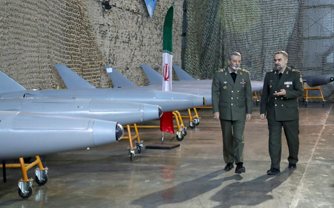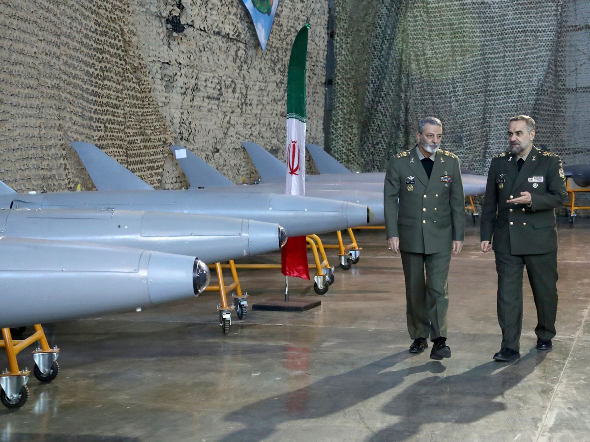 Irans Verteidigungsminister, General Mohammed-Resa Aschtiani (r), spricht mit dem Befehlshaber der Armee, General Abdolrahim Mussawi, während einer Zeremonie zur Übergabe der im Inland gebauten Drohnen an die Armee (Archivbild). - Foto: Uncredited/Iranian Defense Ministry/dpa