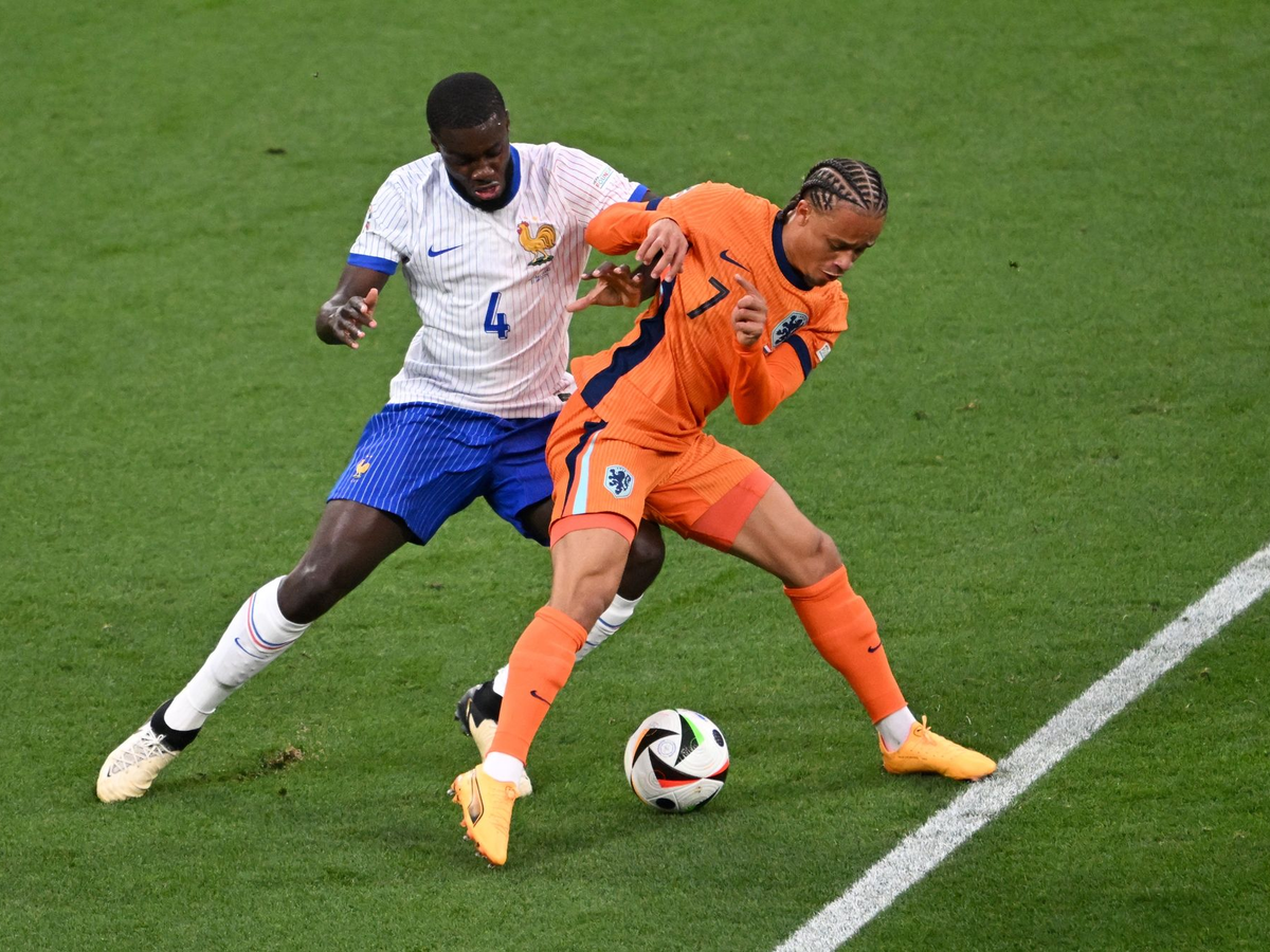 Doch waren es nicht die Franzosen, die fĂŒr die erste starke Szene der Partie sorgten. Nach nur 57 Sekunden wĂ€ren beinahe die NiederlĂ€nder in FĂŒhrung gegangen und das durch eine Bundesliga-Co-Produktion. Xavi Simons von RB Leipzig spielte auf seinem Heim-Terrain den Ball auf Jeremie Frimpong. Der Angreifer von Double-Gewinner Bayer Leverkusen - neu in der Elftal im Vergleich zum 2:1 gegen Polen - scheiterte aber an Frankreichs Keeper Mike Maignan.