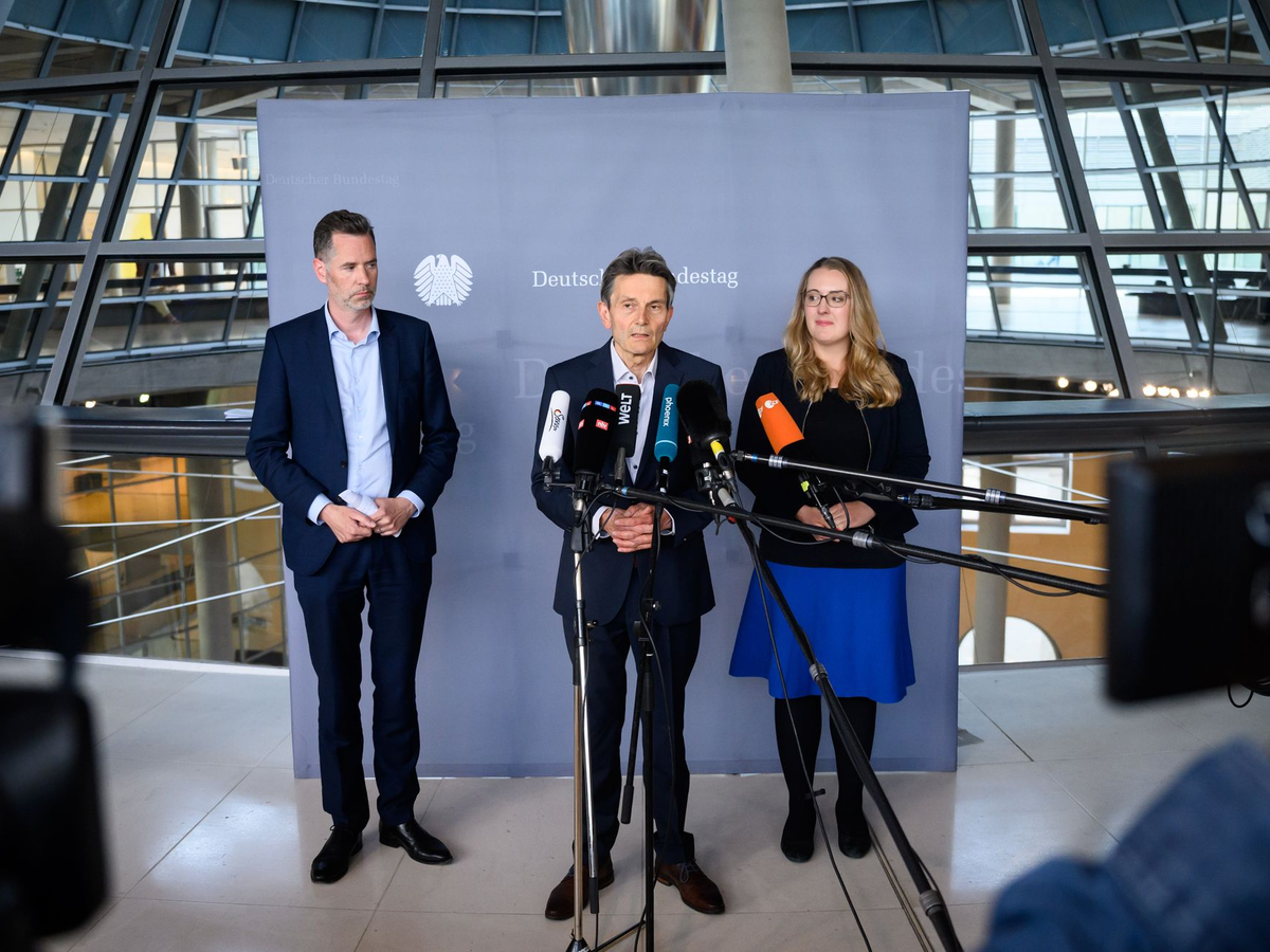 • Die Fraktionsvorsitzenden Christian Dürr (l, FDP), Rolf Mützenich (m, SPD) und Katharina Dröge (r, Bündnis 90/Die Grünen), sprechen über den Entwurf für die Novelle des Gebäudeenergiegesetzes (GEG) nach den Sitzungen der Fraktionen im Deutschen Bundestag. - Foto: Bernd von Jutrczenka/dpa