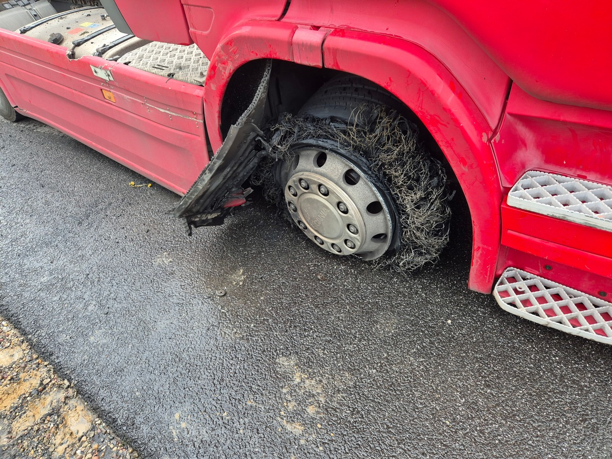 01.08.2025 - 14:16:07 | presseportal.deZur Einsatzzeit kam es zu einem Feuer am vorderen rechten Reifen eines Lkw. Dies bemerkte der Fahrer eines Betonmischers und hielt hinter dem geschädigten Fahrzeug. Da der Betonmischer über ausreichend Wasser verfügte, schloss der Fahrer einen Schlauch an, um den brennenden Reifen zu löschen. Mit seinem schnellen Eingreifen verhinderte der Mann das Übergreifen der Flammen auf das Fahrerhaus.