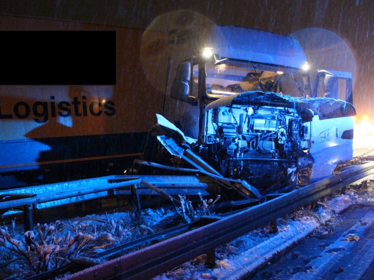 A9 Höhe Saalburg-Ebersdorf - In den frühen Morgenstunden des heutigen Tages kam es auf der A9 zwischen den Anschlussstellen Bad Lobenstein und Schleiz in Fahrtrichtung Berlin zu einem schweren LKW-Unfall. Ein 56-jähriger Tunesier kam mit seinem Sattelzug vom mittleren Fahrstreifen nach rechts ab und kollidierte mit einem dort fahrenden Schwerlasttransport (SLT). Aufgrund des Zusammenstoßes verließ der SLT seinen Fahrstreifen und fuhr in die rechte Leitplanke. Der Unfallverursacher kam nach links ab und kollidierte mit der Mittelleitplanke. Dabei verkeilte sich das Fahrzeug in der Schutzplanke und verschob diese in den Gegenverkehr. Nach bisherigen Erkenntnissen ist die Unfallursache auf eine deutlich zu schnelle und den Witterungsverhältnissen unangepasste Fahrweise zurückzuführen. Es entstand ein Gesamtschaden von etwa 85.000 EUR. Personen wurden nicht verletzt. Beide Richtungsfahrbahnen mussten für ca. zwei Stunden voll gesperrt werden.