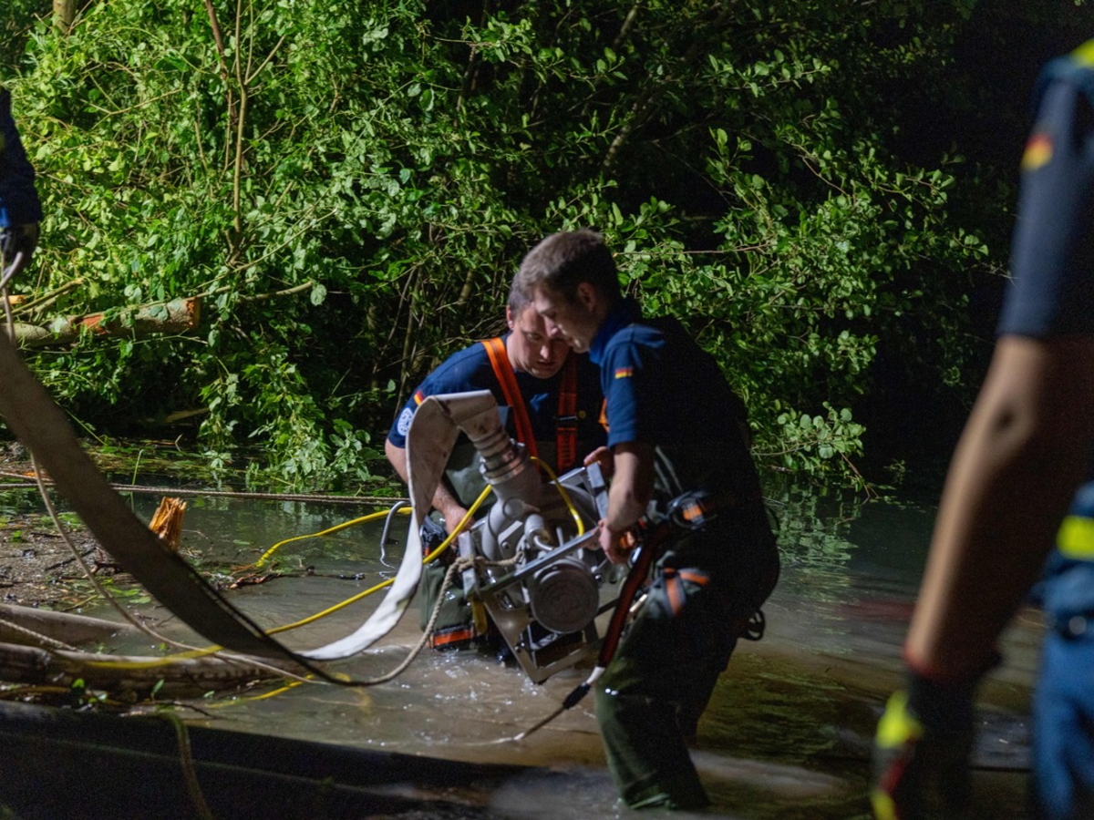 Der Fachzug aus Sachsen und Thüringen unterstützt nach wie vor in Wörth am Rhein. Hier haben unsere ehrenamtlichen Einsatzkräfte u.a. die Aufgabe, Wasser aus einem Baggersee in den Altrhein zu pumpen, um das Überlaufen des Baggersees zu verhindern. Ziel ist zu verhindern, dass Teile der Stadt Wörth geflutet werden. Der Altrhein führt das Wasser auf natürlichem Wege in den Rhein ab, die Stadt wird geschützt. Diese Aufgabe wurde auch während der Nacht weitergeführt. Es wurden weitere Tauchpumpen in Betrieb genommen und 2,6 Kilometer Schlauchstrecke für mehrere Pumpen verlegt. An zahlreichen weiteren Einsatzstellen fördern die Ehrenamtlichen aus allen acht Landesverbänden mit 30 Hochleistungspumpen insgesamt rund 400.000 Liter pro Minute. Außerdem werden die Wasserstände mit vier mobilen Hochwasserpegeln gemessen. THW-Einsatzkräfte unterstützen zudem mit schweren Baumaschinen, um Trümmer und Schlamm zu entfernen.