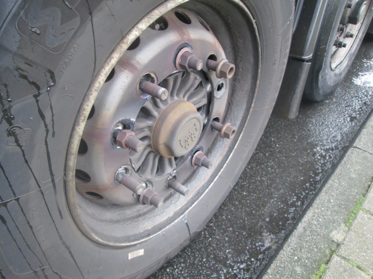 Ein 43-jĂ€hriger Mann aus Spanien befuhr mit einem Sattelzug, beladen mit Lebensmitteln, die Autobahn 1 in Richtung Hamburg und wurde auf dem Parkplatz Delmetal gestoppt. Bei der ĂberprĂŒfung des SattelanhĂ€ngers stellten die Beamten gravierende MĂ€ngel fest, die zu einer Untersagung der Weiterfahrt fĂŒhrten. An einer Achse des Aufliegers hatten sich mehrere Radmuttern gelöst. Eine feste Verbindung zwischen Rad und Nabe bestand nicht mehr, die Felgenlöcher waren bereits ausgeschlagen. Es drohte der vollstĂ€ndige Verlust des Rades.