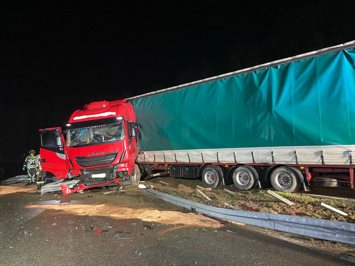 BAB 6; Landstuhl - Am frühen Freitagmorgen, kam es am Autobahnkreuz Landstuhl zu einem schweren Verkehrsunfall mit einer leichtverletzten Person. Der 59-jährige Fahrer, war mit seinem Sattelzug auf der BAB 6 in Richtung Saarbrücken unterwegs und wollte am Autobahnkreuz Landstuhl auf die BAB 62 in Richtung Trier wechseln. Hierbei kam er infolge regennasser Fahrbahn und nicht angepasster Geschwindigkeit ins Schleudern. Der Satttelzug durchbrach die Schutzplanken und kam quer zur Fahrbahn zum Stehen. Das Gefährt blockierte dadurch den Zubringer der BAB 62 in Fahrtrichtung Trier und Pirmasens. Der Fahrer wurde augenscheinlich nur leichtverletzt und mit einem Rettungswagen vorsorlich in ein Kranknhaus transportiert. Die Feuerwehr Ramstein war zur Sicherung des havarierten Satttelzuges und Bindung auslaufender Betriebsmittel ebenfalls im Einsatz. Bei der Unfallaufnahme stellte sich heraus, dass gegen den 59-jährigen Fahrer ein Haftbefehl bestand. Da der Unglücksrabe diesen durch Zahlung der Strafe nicht abwenden konnte, führte dessen Weg nach Entlassung aus dem Krankenhaus daher nicht in die Freiheit, sondern in die JVA Frankenthal. Aufgund des masiven Schadens an den Schutzplanken und der schwierigen Bergung des Sattelzuges, wird es im Bereich des Autobahhnkreuzes Landstuhl voraussichtlich bis zum frühen Freitagabend zu erheblichen Behinderungen kommen. Insgesamt dürfte der entstandene Sachschaden im sechsstelligen Euro-Bereich liegen.