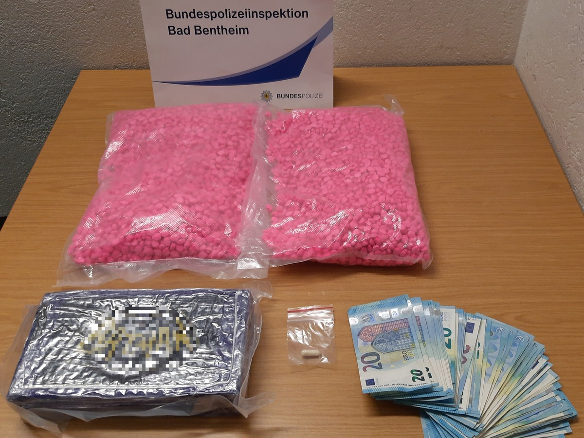In der Jacke des 32-Jährigen fanden die Beamten dann auch eine Pille mit augenscheinlich Amphetamin. Ein bei ihm durchgeführter Drogenschnelltest war zudem positiv. Durch einen Drogenwischtest konnten außerdem Rückstände von Kokain in dem Auto nachgewiesen werden, weshalb sich die Beamten das Fahrzeug näher ansahen. Im Fahrzeuginneren stießen die Bundespolizisten auf ein nachträglich eingebautes Versteck, in dem rund 1,2 Kilo Kokain und zwei Plastikbeutel mit insgesamt rund 4 Kilo Ecstasy-Tabletten lagen. Außerdem hatte der Mann über 1.000 Euro Bargeld dabei.