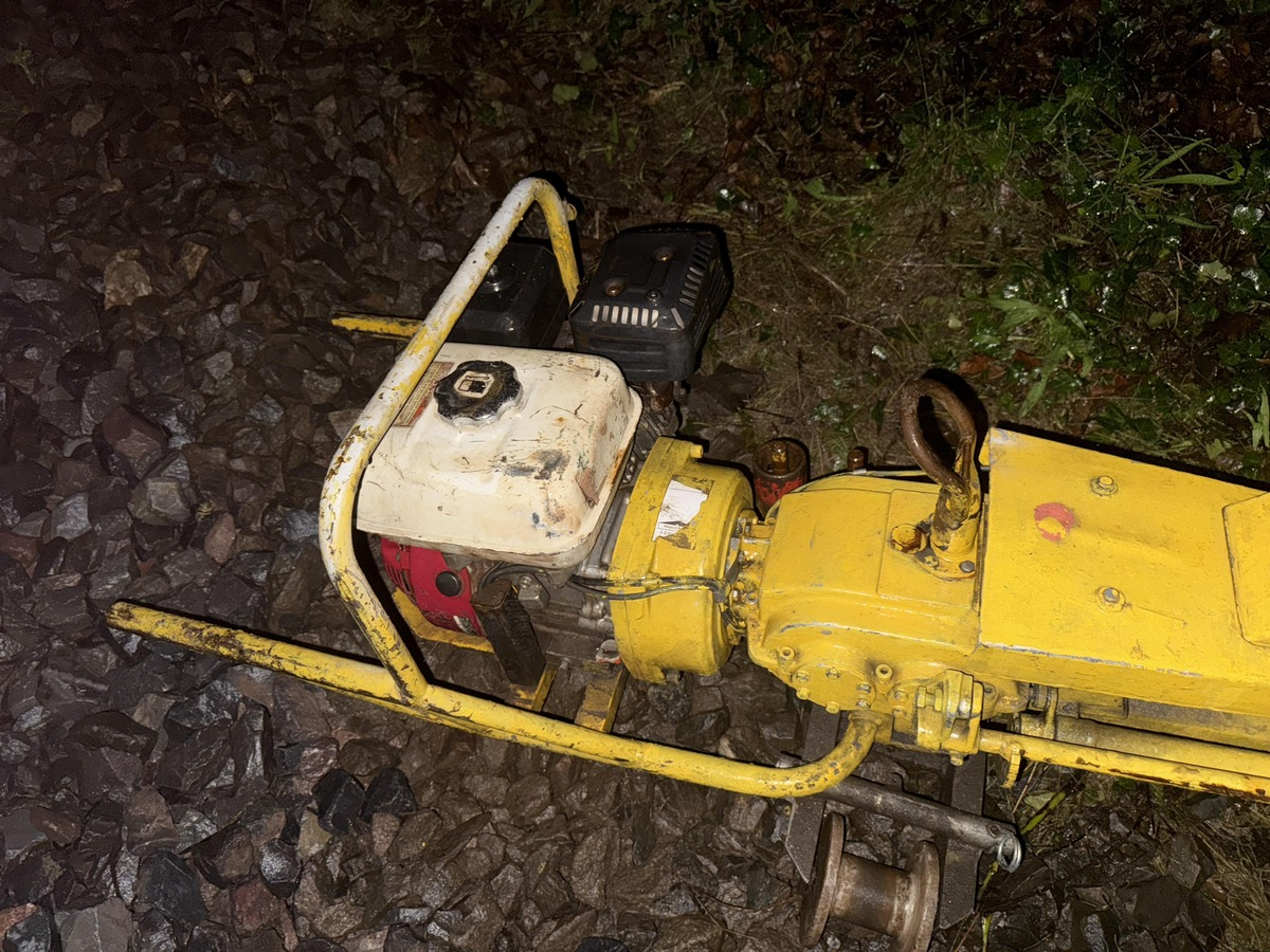 Nach bisherigen Erkenntnissen ist zu vermuten, dass eine oder mehrere unbekannte Person/en im Zeitraum von ungefÀhr 23:00 Uhr bis 00:00 Uhr die neben dem Gleisbett abgelegte Maschine auf den Gleisen platzierte.