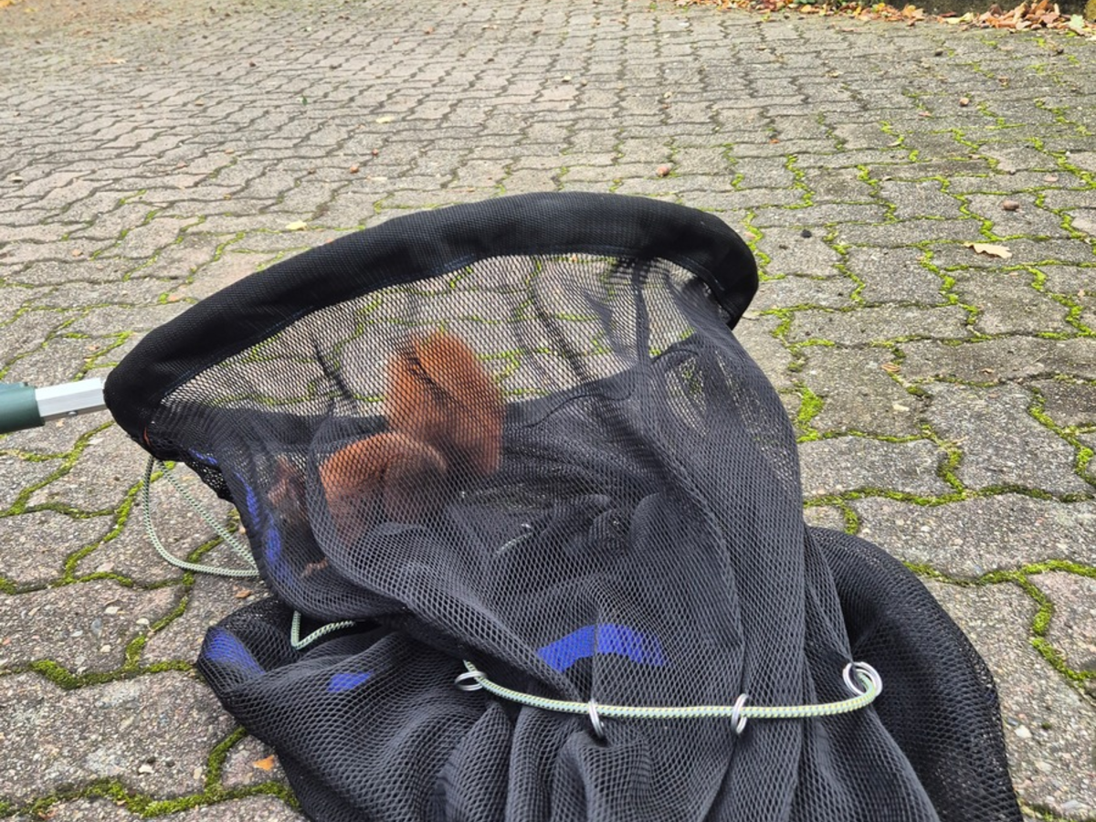 Nach einer kurzen Erkundung und Lageeinschätzung wurde das Eichhörnchen im Laden gesichtet,umstellt und mit einem Kescher versucht einzufangen. Mehrmals konnte das flinke Tier bei diesen Einfangversuchen jedoch entwischen und tobte durch das Geschäft.