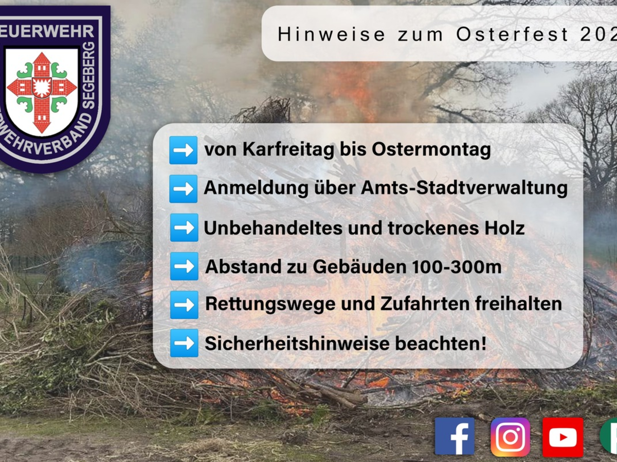 Informieren Sie sich bitte im Vorwege, ob Sie Ihr Brauchtumsfeuer anmelden müssen. Der NOTRUF 112 nimmt keinerlei Anmeldungen dieser Art an oder genehmigt diese. Sollte es durch Dritte zu einem Notruf kommen, wird dieses ggf. einen Einsatz der Feuerwehr nach sich ziehen! Kleinere Lagerfeuer, Feuerkörbe oder auch kleinere Feuerstellen sind ausgenommen. Weiter ist darauf zu achten, dass die Tier- und Pflanzenwelt sowie Nachbargebäude ausreichend geschützt sind. Innerhalb von Naturschutzgebieten und den Kernzonen von Landschaftsschutzgebieten sind Osterfeuer und dazugehörige Veranstaltungen verboten. Gleiches gilt, wenn dieses in der Nähe zu Reetdachhäusern, Wald- und Moorgebieten sowie Heideflächen stattfinden soll.
