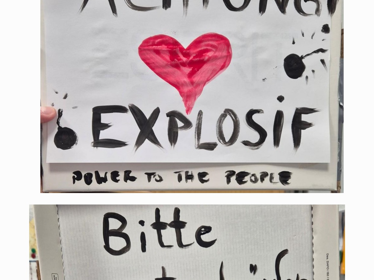 BFrau mit verdÀchtigem Schild im Hauptbahnhof Mainz