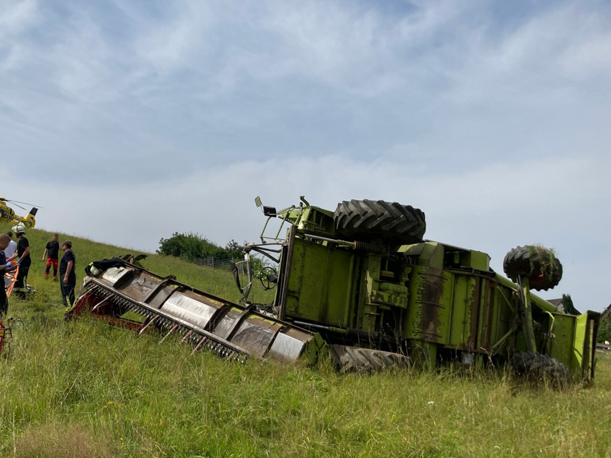 Birkenau-Hornbach: MĂ€hdrescher ĂŒberschlĂ€gt sich mehrfach/ Rettungshubschrauber im Einsatz