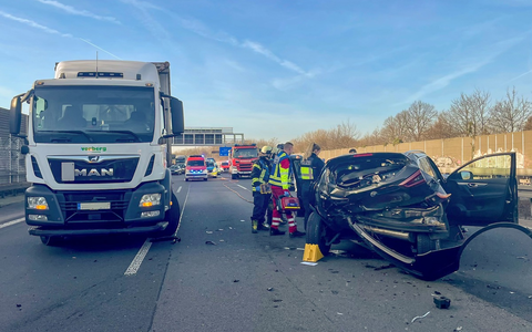 Bochum - Am Dienstagmittag gegen 13:50 Uhr ereignete sich auf der A 448 zwischen dem Autobahnkreuz Bochum/Witten und der Anschlussstelle Witten ein Verkehrsunfall, an dem zwei Pkw sowie ein Lkw beteiligt waren. Der Fahrer eines der beiden Pkw wurde bei dem Zusammenstoß in seinem Fahrzeug eingeschlossen und musste durch Einsatzkräfte der Feuerwehr aus dem Wagen befreit werden. Anschließend erfolgten die medizinische Erstversorgung durch einen Notarzt sowie durch eine Rettungswagenbesatzung. Der Patient wurde im Anschluss in ein Krankenhaus transportiert. Der Fahrer des beteiligten Lkw blieb unverletzt. Auch die beiden Insassen des zweiten Pkw erlitten keine schweren Verletzungen und konnten nach einer Untersuchung durch den Rettungsdienst am Einsatzort verbleiben. Für die Dauer der Rettungsmaßnahmen und der Unfallaufnahme war die A 448 in Fahrtrichtung Dortmund zeitweise vollständig gesperrt. Zur Unfallursache hat die Autobahnpolizei die Ermittlungen aufgenommen.