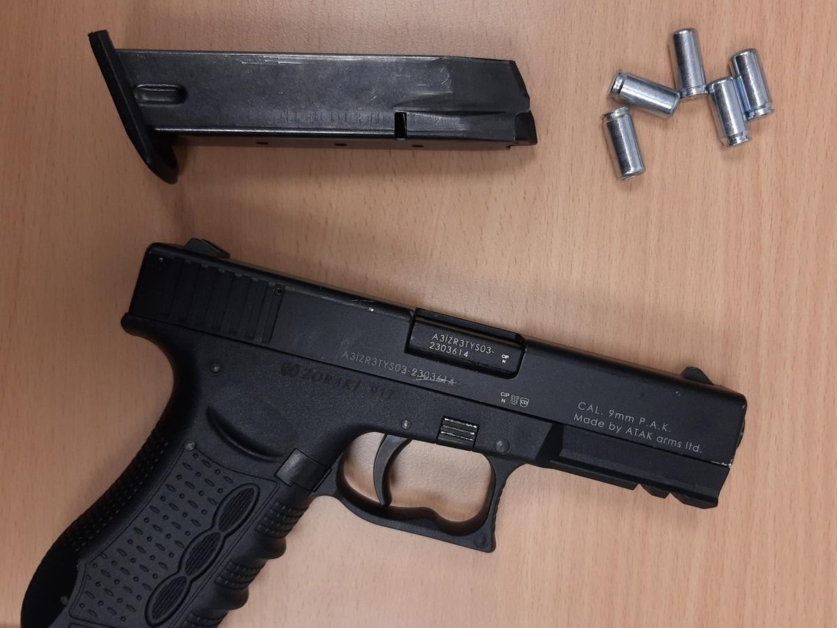 Die Bundespolizisten nahmen sofort die Verfolgung auf und konnten den Flüchtigen in der Bahnhofsstraße stellen. Während seiner Verfolgung griff der 16-Jährige in seine Jackentasche und zog eine vermeintliche Schusswaffe heraus. Diese fiel ihm jedoch aus der Hand. Die Bundespolizisten brachten den jungen Mann zu Boden und fesselten ihn. Bei der Überprüfung der Waffe stellte sich heraus, dass es sich um eine geladene Schreckschusswaffe handelte.