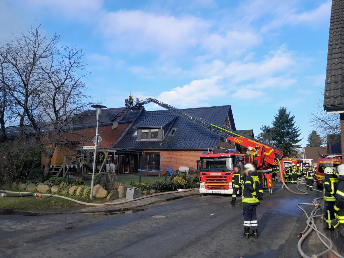 Vor Ort wurden mit Hilfe der Drehleiter und Kräften der Ortsfeuerwehr die Dachhaut und die darunterliegende Isolierung eines Stallgebäudes aufgenommen und abgelöscht, sodass eine Brandausbreitung auf das angrenzende Wohngebäude verhindert werden konnte.