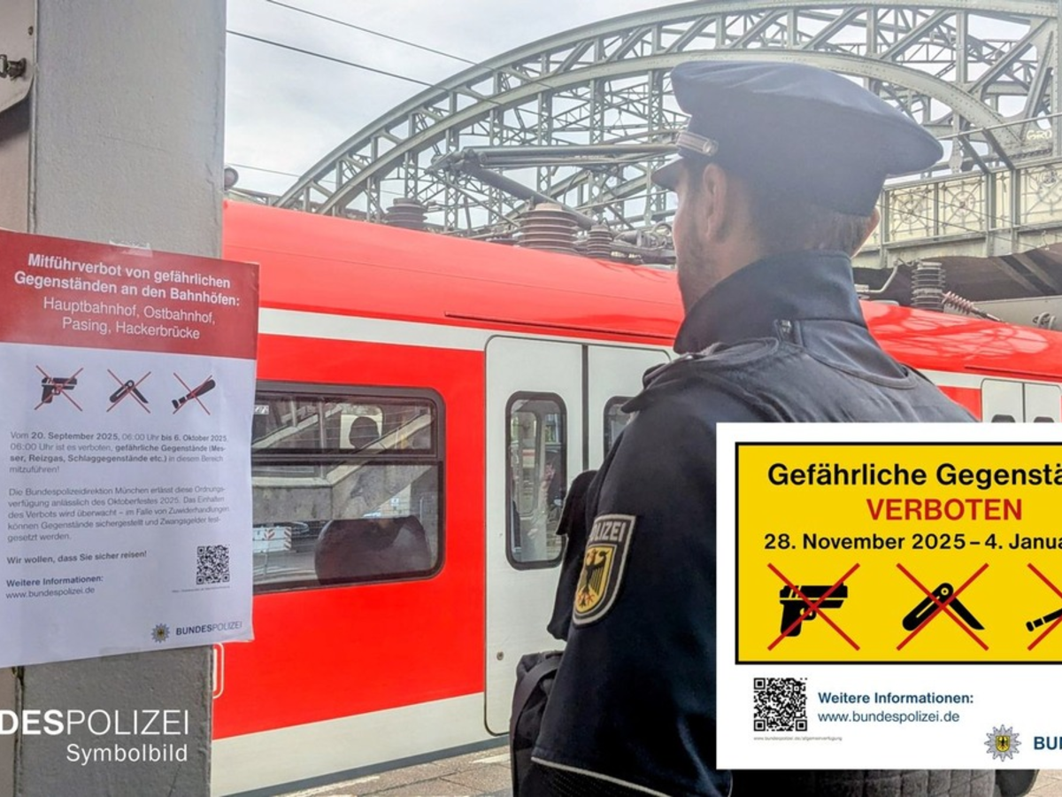 Die Bundespolizei verweist auf die vermehrten stichpunktartigen Kontrollen in Haupt-, Ost- und Pasinger Bahnhof sowie den S-Bahnhaltepunkten Marienplatz, Karlsplatz (Stachus) und Hauptbahnhof und bittet Reisende und Bahnhofsbesucher um Beachtung der Allgemeinverfügung.