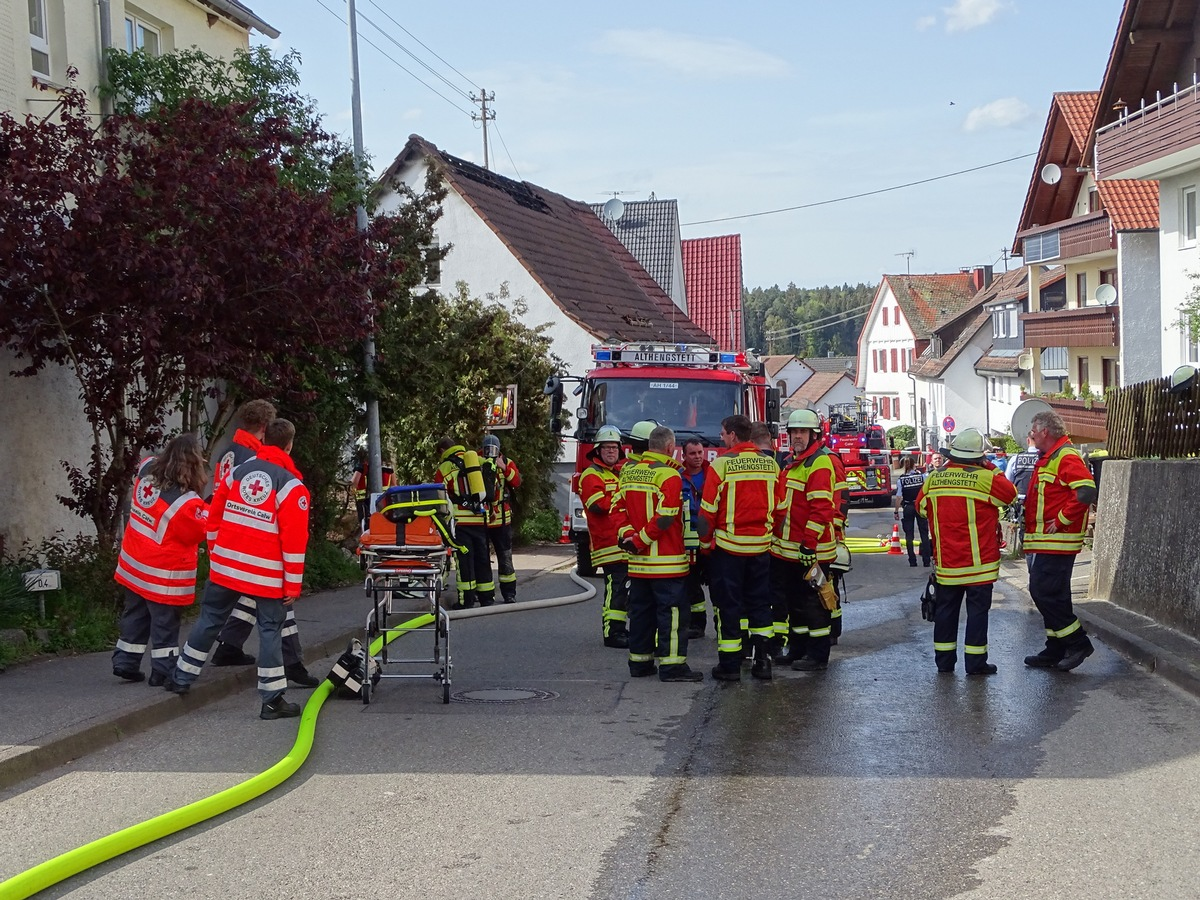 Calw - Eine Nachbarin entdeckte am Montag gegen 15 Uhr den Brand im Dachstuhl des Hauses einer vierköpfigen Familie an der Ortsdurchfahrt in Ottenbronn und alarmierte die Feuerwehr. Die betroffenen Personen verließen unterdessen das Gebäude. Brandschutzkräfte aus Althengstett, Calw und Bad Liebenzell sowie die Führungsgruppe des Gemeindeverwaltungsverbands Althengstett- Gechingen- Ostelsheim- SImmozheim eilten an den Brandort. Während die ersten Trupps unter Atemschutz in das Innere des Hauses vordrangen, öffneten weitere Einsatzkräfte über die Calwer Drehleiter das Dach. "Der Brand hatte sich auf die komplette Länge des Dachstuhls ausgedehnt", fasste Einsatzleiter Markus Schwarz, stellvertretender Kommandant der Gesamtwehr Althengstett erste Erkenntnisse zusammen. Insgesamt waren schließlich vier Trupps mit je zwei Feuerwehrleuten unter Atemschutz zur Brandbekämpfung eingesetzt. Gleichwohl stellte die Photovoltaikanlage auf der Südseite des Daches eine Herausforderung dar. "Sie liegt tiefer als der Giebel, muss aber vom Netz genommen oder abgebaut werden", erläuterte der Einsatzleiter und zog einen Elektrofachbetrieb hinzu, der letztlich die Netzverbindung kappte. Zuvor hatte die ENBW die Seite des betroffenen Straßenzugs vom Strom getrennt. Später erhielten die benachbarten Häuser wieder Strom. An die Einsatzstelle kam auch Althengstetts Bürgermeister Rüdiger Klahm, um den Bedarf einer Unterkunft für die Familie zu klären, die jedoch im persönlichen Umfeld untergebracht wurde. Insgesamt waren 67 Feuerwehrleute mit 15 Fahrzeugen im Einsatz. Deren Verbrauch an Atemschutzgeräten und Schläuchen wurde zudem von der Zentralen Feuerwehrwerkstatt des Landkreises Calw vor Ort ausgetauscht, um die Einsatzbereitschaft aufrecht zu erhalten. Außerdem war die Einsatzgruppe Bereitschaft des Deutschen Roten Kreuzes Ortsverein Calw mit elf Rettungskräften vor Ort und versorgte dabei unter anderem die Feuerwehrleute mit Getränken. Die Polizei war mit drei Fahrzeugen und fünf Beamten im Einsatz und sperrte die Ortsdurchfahrt. Sie beziffert den Schaden auf eine untere sechsstellige Summe, während zur Brandursache noch keine Angaben gemacht werden können. Mit einer Brandwache bis in den späten Abend sicherte die Feuerwehr das Gebäude und kontrollierte kontinuierlich, ob Glutnester entstanden.
