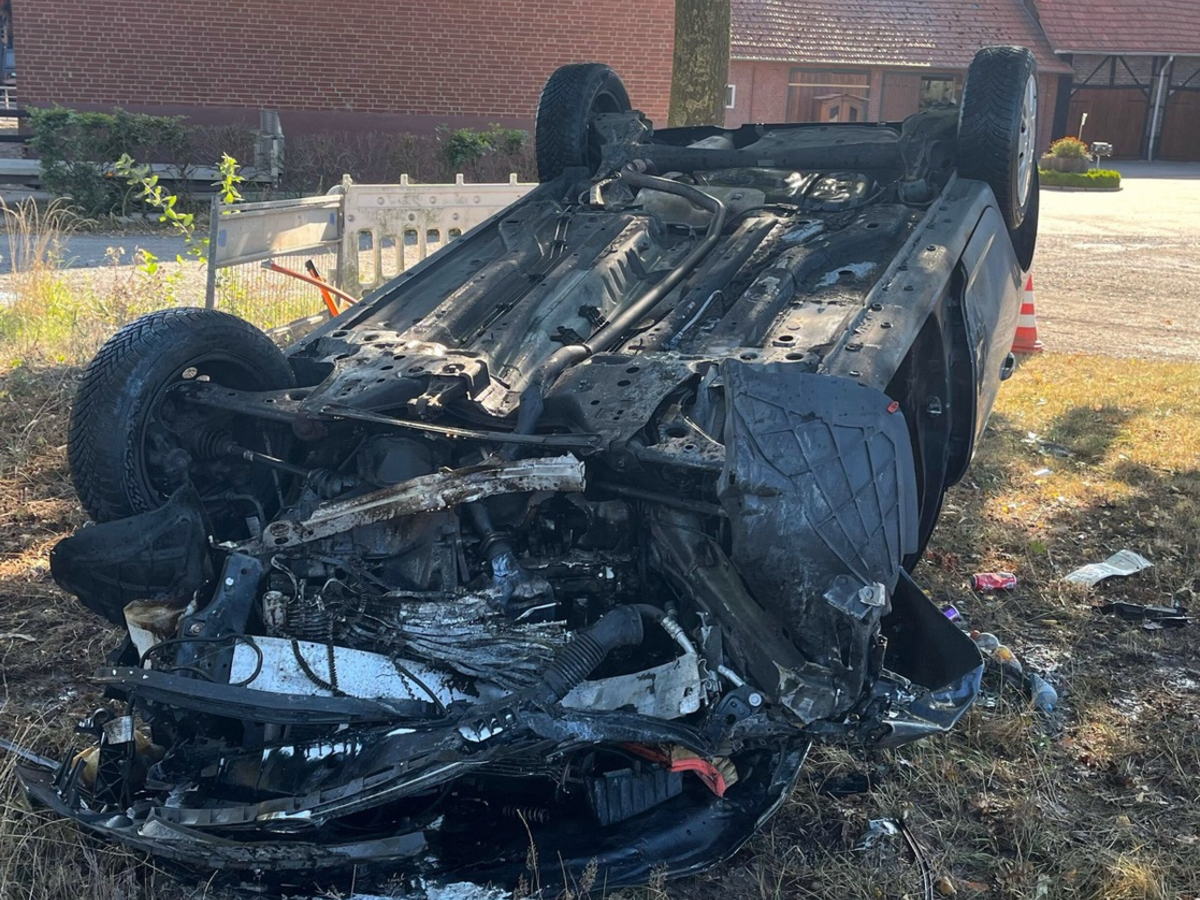 19.08.2025 - 08:39:35 | presseportal.deDas Auto prallte gegen einen Findling sowie den Pfahl eines Straßenschildes. Durch den Aufprall schleuderte der Findling rund 30 Meter über ein Grundstück. In der Folge kollidierte der 21-Jährige mit einem weiteren Findling. Das Auto blieb auf der dortigen Wiese auf dem Dach liegen. Anschließend geriet dieses in Brand. Der Fahrer konnte sein Fahrzeug jedoch eigenständig verlassen. Er kam verletzt mit einem Rettungswagen in ein Krankenhaus. Die Straße war während der Unfallaufnahme gesperrt.