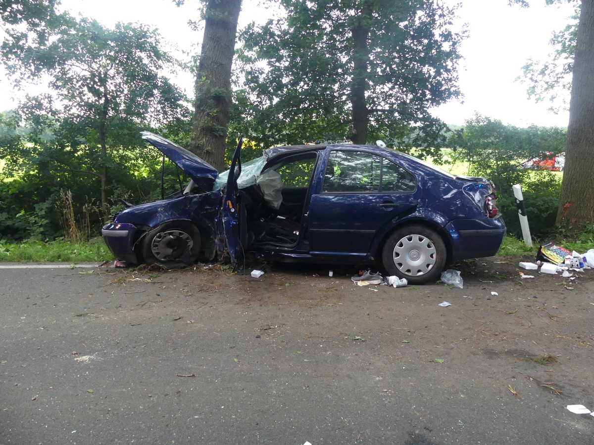 Am 24.08.2025, gegen 06:30 Uhr, kam es auf der L119, zwischen Neuenwalde und Fickmühlen, 27607 Geestland, zu einem schweren Verkehrsunfall mit einer lebensgefährlich verletzten Person. Dabei fuhr ein 31-jähriger Mann aus der Wurster Nordseeküste mit seinem Pkw aus bislang unerklärten Gründen über die Gegenspur und lenkte anschließend schlagartig nach rechts, sodass sein Fahrzeug ins Schleudern kam und mit der Fahrerseite gegen einen Baum aufschlug. Der Fahrzeugführer wurde mithilfe eines Rettungshubschraubers in ein Krankenhaus geflogen. Der Pkw erlitt einen Totalschaden in Höhe von 5000EUR. Die Unfallstelle auf der L119 wurde bis 10:30 Uhr beidseitig zwecks anhaltender Ermittlungsarbeiten gesperrt.