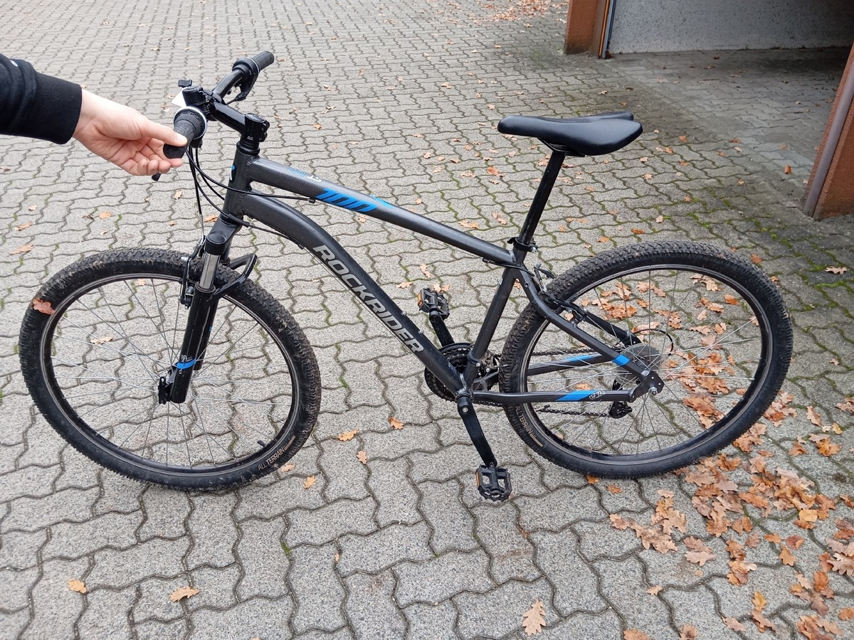 Es handelt sich hierbei um ein Fahrrad der Marke Decathlon - Rockrider ST100 in blauschwarz.