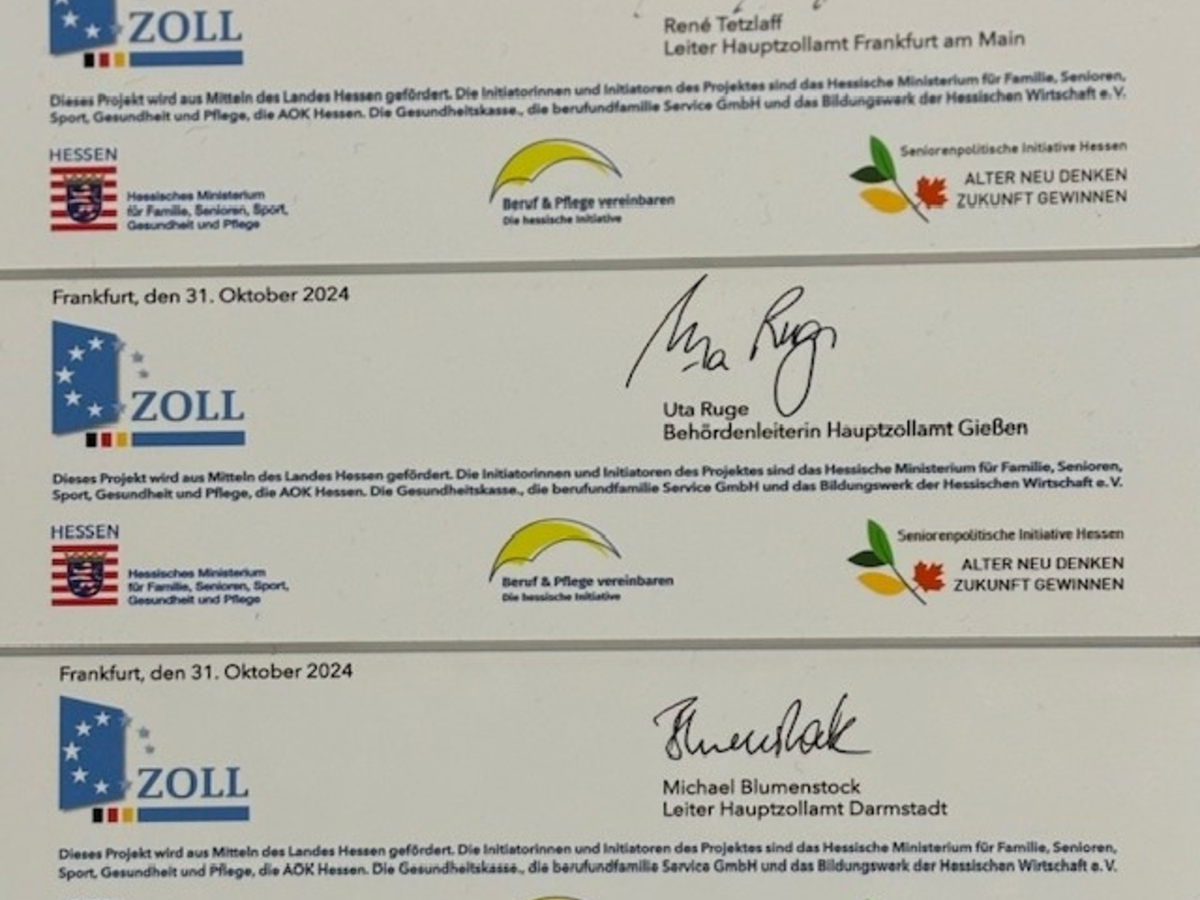 Im Rahmen einer offiziellen Verleihung wurde am 31. Oktober den drei Hauptzollämtern - neben 21 weiteren hessischen Unternehmen und Organisationen - die Charta-Urkunde für die Vereinbarkeit von Pflege und Beruf durch die Hessische Ministerin für Familie, Senioren, Sport, Gesundheit und Pflege, Diana Stolz, überreicht. Neben der bereits bestehenden Auditierung von Beruf und Familie haben die Hauptzollämter in Hessen damit einen weiteren Meilenstein zu den Vereinbarkeitsthemen gesetzt.