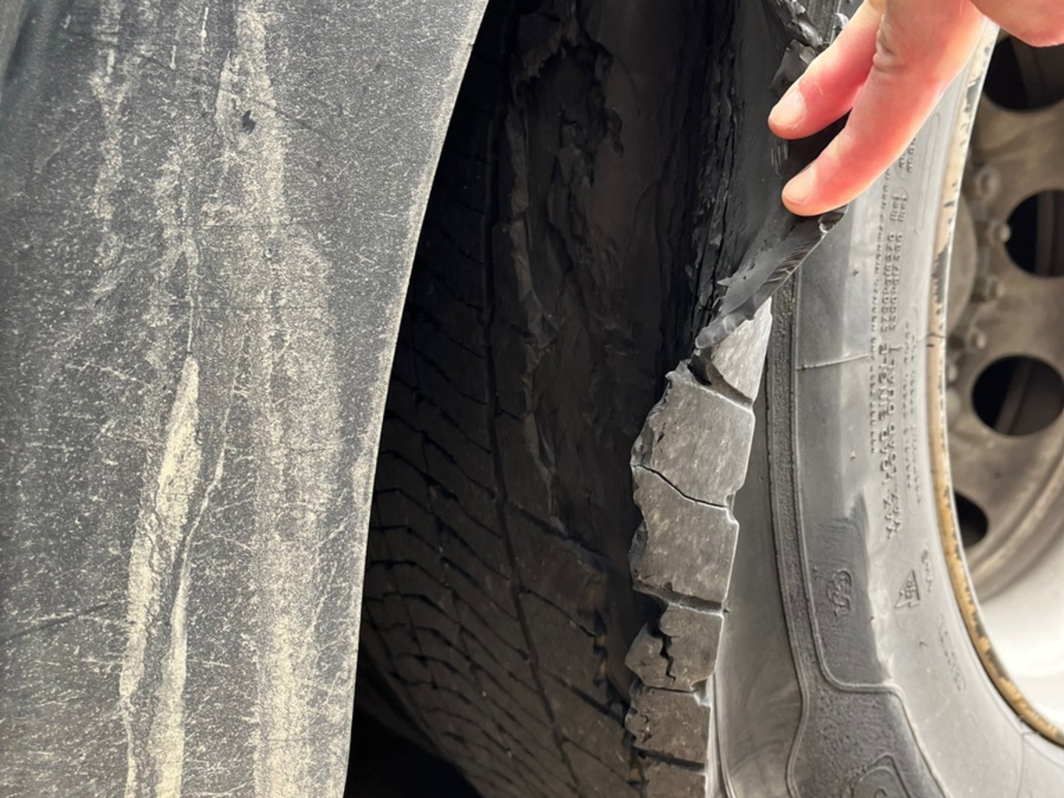 Auf dem Reifen der Antriebsachse löste sich bereits die Karkasse ab.