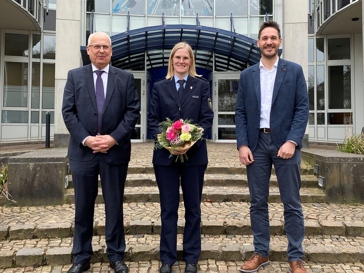 Hochsauerlandkreis - Nachdem Polizeidirektor Carsten Robe Ende September 2023 in den Ruhestand getreten ist, wird die Direktion Gefahrenabwehr/Einsatz ab sofort von der Polizeioberrätin Mareen Weische geleitet. Am 27. März 2024 wurde die neue Direktionsleiterin durch den Landrat Dr. Karl Schneider im Mescheder Kreishaus begrüßt. Für Mareen Weische ist das Sauerland nicht neu. Im Rahmen Ihres dualen Studiums im Polizeivollzugsdienst versah die 41-Jährige in den Jahren zwischen 2001 und 2004 bereits erste Dienste hier im Hochsauerlandkreis. Und auch ihr privater Lebensmittelpunkt liegt in der flächengrößten Polizeibehörde NRWs. Ihr beruflicher Werdegang führte die Polizeioberrätin nach der Beendigung ihres Bachelorstudiums im Jahr 2004 über Stationen bei der Bereitschaftspolizei in den Wachdienst und zur Kriminalpolizei. Im Jahr 2013 begann sie das weiterführende Masterstudium zum Aufstieg in den Höheren Dienst der Polizei, das sie 2017 erfolgreich abschließen konnte. Seitdem war Mareen Weische als Leiterin des Leitungsstabs und als Leiterin der Direktion Verkehr im Märkischen Kreis tätig. Zuletzt war sie für die Fachaufsicht Fortbildung am polizeilichen Landesamt für Ausbildung, Fortbildung und Personalangelegenheiten verantwortlich. Neben Dr. Karl Schneider freut sich auch Mareen Weische selbst, dass sie von heute an Dienst für die Polizei im Hochsauerlandkreis versieht: "Ich bin gespannt auf die verantwortungsvolle Aufgabe hier im Sauerland. Es ist ein gutes Gefühl, selber ein Stück weit zur Sicherheit meiner Heimat beitragen zu können". In ihrem neuen Aufgabenbereich als Leiterin der Direktion Gefahrenabwehr/Einsatz ist Mareen Weische für polizeiliche Gefahrenabwehr- und Einsatzangelegenheiten zuständig. Dazu gehören auch die Polizeiwachen und der Bezirksdienst.