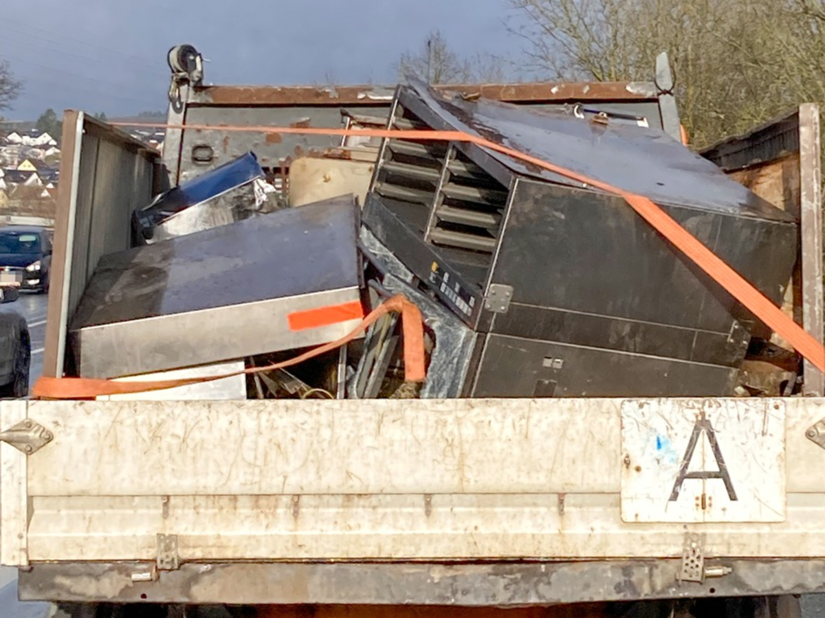 Empfindliche Geldbußen kommen auf den Fahrer und den Halter eines Lkw zu, der mit geladenen Schrottteilen am 23.12.2024 auf der B277 bei Wetzlar gestoppt wurde. Den Experten des regionalen Verkehrsdienstes Lahn-Dill war das Gefährt zunächst wegen mangelnder Ladungssicherung aufgefallen. Die Kontrolle brachte zutage, dass auf der Ladefläche unter anderem Elektroaltgeräte geladen worden waren. Hierzu konnte der Fahrer keine entsprechende Genehmigung des RP Gießen vorweisen. Zudem bezeichneten die Ordnungshüter die Ladungssicherung in ihrem Bericht als "unterirdisch". Diese musste vor der Weiterfahrt nachgebessert werden. Den Fahrer erwartet in diesem Zusammenhang ein Bußgeld in Höhe von 60 Euro sowie ein Punkt in der Verkehrssünderkartei in Flensburg. Wegen der fehlenden Genehmigung zum Transport von Elektroaltgeräten werden gegen den Fahrer und den Halter Verfahren wegen des Verstoßes gegen das Kreislaufwirtschaftsgesetzes eingeleitet. Hier drohen Bußgelder im unteren vierstellen Eurobereich.
