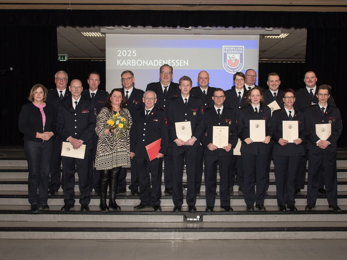Dinslaken - Ca. 200 GĂ€ste hatten sich in der Aula des Gustav-Heinemann-Schulzentrums eingefunden, um mit dem Löschzug Hiesfeld zu feiern. Besonders freute sich der LöschzugfĂŒhrer RĂŒdiger Paetzel ĂŒber die Anwesenheit zahlreiche Förderer des ehrenamtlichen Engagements sowie ĂŒber die Anwesenheit der Vertreter der Verwaltung, der Fraktionen des Rates, der Hilfsorganisationen und der benachbarten LöschzĂŒge. Ebenfalls konnten die BĂŒrgermeisterin, Frau Michaela Eislöffel und der Leiter der Feuerwehr, Ulrich Borgmann begrĂŒĂt werden. Beide wĂŒrdigten in ihren Reden die Leistungen der Hiesfelder Wehr und betonten die Bedeutung des ehrenamtlichen Feuerwehrdienstes fĂŒr das Allgemeinwohl der BĂŒrger. Im RĂŒckblick auf das Jahr 2024 bedankte sich Frau Eislöffel bei den EinsatzkrĂ€ften fĂŒr die Erledigung von ĂŒber 80 EinsĂ€tzen. Auch sei der Löschzug Hiesfeld ein wichtiger und verlĂ€sslicher Partner fĂŒr das Vereins- und kulturelle Leben im Dorf und in der Stadt Dinslaken. Ulrich Borgmann erinnerte noch einmal an die zeitintensiven EinsĂ€tze bei zwei Starkregenereignissen im Stadtgebiet und an den mehrstĂŒndigen ĂŒberörtlichen Einsatz bei den Grillo - Werken in Duisburg. Des Weiteren bedankte er sich bei den ca. 50 Frauen und MĂ€nnern der Einsatzabteilung fĂŒr die Bereitschaft sich in der Freizeit unentgeltlich stĂ€ndig fĂŒr den Einsatz am BĂŒrger fort- und weiterzubilden. Im Rahmen des Jahresfestes konnten wieder mehrere Ehrungen und Beförderungen ausgesprochen werden.