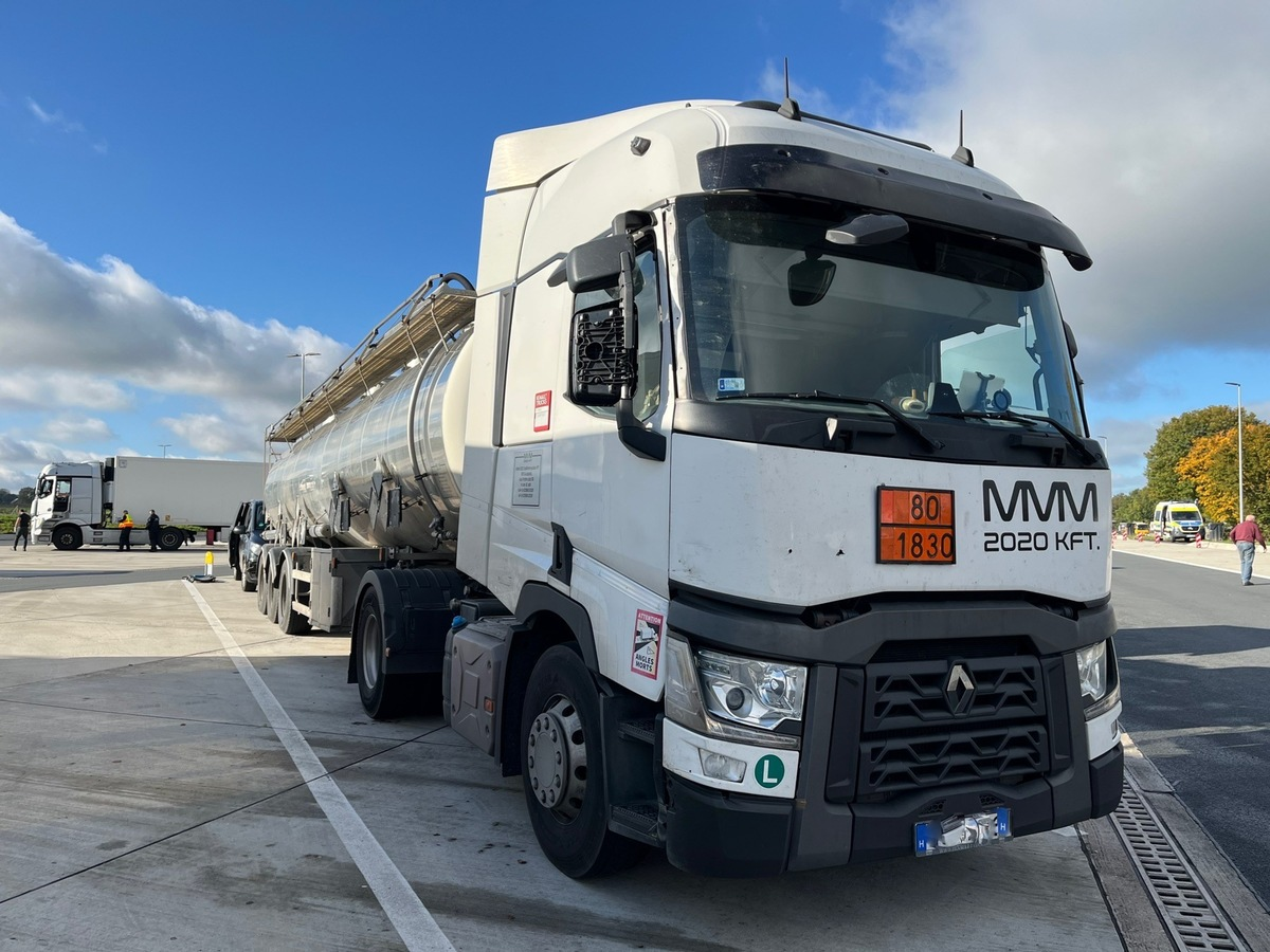Auf der Autobahn 44 bei Werl stoppte die Autobahnpolizei am Dienstag (22.10.2024) einen mit 24 Tonnen Schwefelsäure beladenen Gefahrgut-Transporter. Die Fahrt mit einem Ziel in Ungarn endete auf der Rastanlage Haarstrang Süd. Die Polizei untersagte dem Fahrer die Weiterfahrt, da an drei Rädern die Bremsen defekt waren. Dazu kamen Durchrostungen und Brüche an tragenden Karosserieteilen.