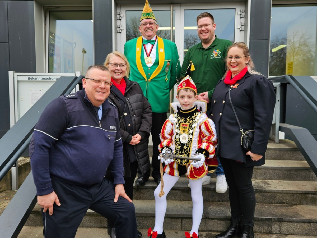 Ein besonderes Highlight war die symbolische Machtübernahme: Stellvertretend für die Kreispolizeibehörde Düren überreichte Polizeihauptkommissar Sascha Dominiczak dem jungen Prinzen feierlich den Schlüssel zur Polizeiwache - ein Zeichen der närrischen Regentschaft während der tollen Tage. Anschließend bedankte sich Fynn II. bei mit Karnevalsorden und verriet dabei, dass er den Wunsch hat, später selbst einmal Polizist zu werden.