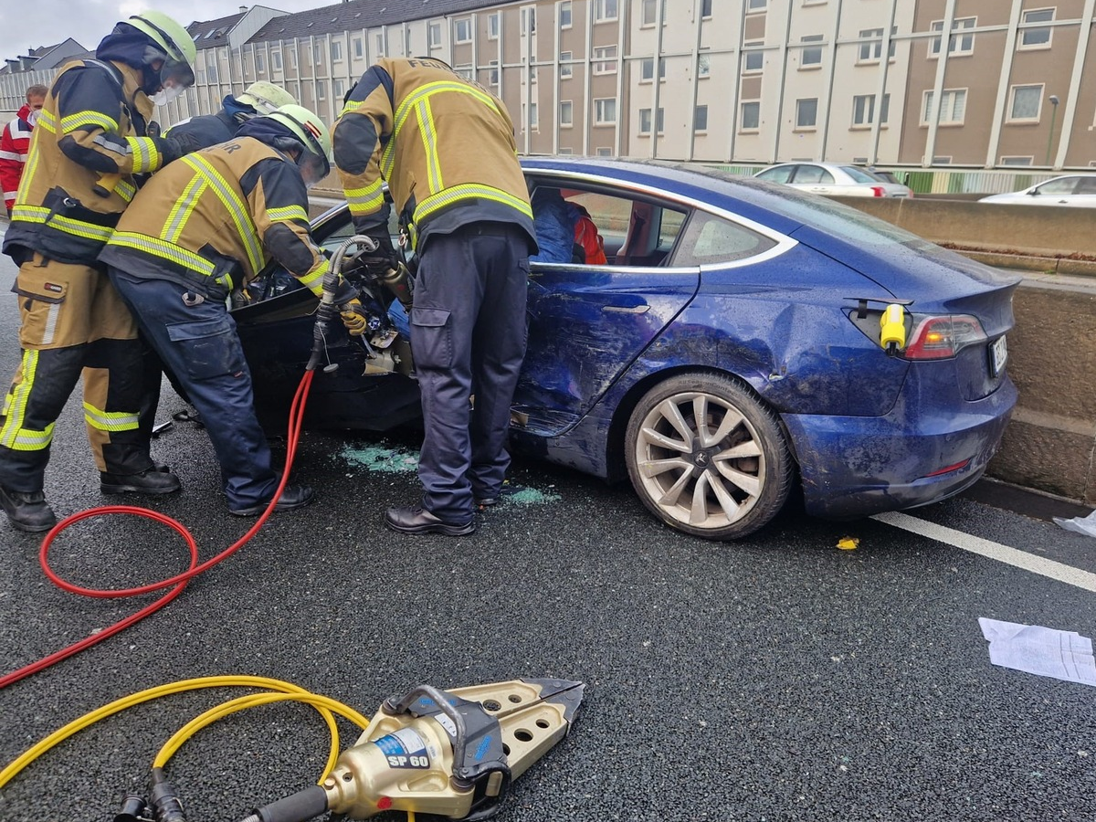 Essen, Bundesautobahn A40, 04.01.2024, 12:15 Uhr - Heute Mittag, am 04.01.2024 um 12:15 Uhr, wurde die Feuerwehr Essen zu einem Verkehrsunfall auf die Bundesautobahn A40 in Fahrtrichtung Bochum alarmiert. Kurz vor der Anschlussstelle Essen-Kray war es zu einem Verkehrsunfall zwischen einem Pkw der Marke Tesla und einem Lkw gekommen. Durch den Zusammenstoß der beiden Fahrzeuge drehte sich der Pkw, kollidierte mit der Mittelleitplanke und kam entgegengesetzt der Fahrtrichtung zum Stehen. Bedingt durch den Unfall wurde die Fahrertür des Tesla stark beschädigt und der Fahrer in seinem Fahrzeug eingeschlossen. Sofort entsandte die Leitstelle der Feuerwehr umfangreich Rettungskräfte zur Einsatzstelle, um die notwendigen Rettungsmaßnahmen einzuleiten. Diese sicherten unverzüglich die Einsatzstelle ab, stellten den Brandschutz sicher und begannen mit der Befreiung der eingeschlossenen Person. Durch den Einsatz von hydraulischen Rettungsgeräten wurde die Fahrertür entfernt und so ein Zugang zu dem verletzten Fahrzeugführer geschaffen. Anschließend wurde dieser durch den Rettungsdienst erstversorgt und im weiteren Verlauf die Wirbelsäule immobilisiert, um den Fahrer schonend aus dem Fahrzeug retten zu können. Nach einer notärztlichen Behandlung wurde der Patient in ein Essener Krankenhaus transportiert. Der Fahrer des Lastkraftwagens blieb, bis auf den Schock, unverletzt.