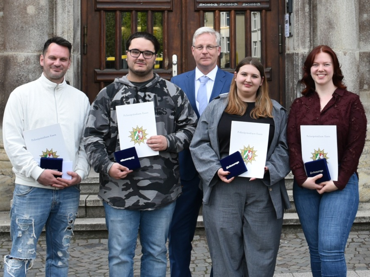 Essen - 45131 E.-Rüttenscheid: Am Mittwoch (15. April) hat Polizeipräsident Andreas Stüve mehreren Bürgerinnen und Bürgern einen Preis für besondere Zivilcourage verliehen. Im Polizeipräsidium kamen Männer und Frauen zusammen, die im vergangenen Jahr etwas Besonderes geleistet haben, um anderen zu helfen. "Was Sie getan haben, ist nicht selbstverständlich", sagt Polizeipräsident Andreas Stüve anerkennend zu den vier Geehrten, die am Mittwochnachmittag ins Polizeipräsidium gekommen sind, um den Zivilcourage-Preis in Empfang zu nehmen. So hat Sascha-Daniel M. im Juli 2025 drei Kinder aus dem Niederfeldsee in Essen-Altendorf gerettet. Der Essener hatte gesehen, dass die Kinder (damals drei, sieben und neun Jahre alt) in dem See spielten, plötzlich aber regungslos auf dem Bauch im Wasser trieben. Sascha-Daniel M. reagierte sofort, ging selbst in den See und rettete die Kinder. Alle drei waren kurzzeitig bewusstlos, das dreijährige Mädchen wurde von Sascha-Daniel M. erfolgreich reanimiert. Am 5. September stach ein Schüler eines Essener Berufskollegs mehrfach mit einem Messer auf seine Lehrerin ein. Kurz nach der Tat trafen Hannah S. und Enrico P. auf dem Schulflur auf die verletzte Lehrerin und leisteten Erste Hilfe. Dabei riskierten sie durchaus ihre eigene Gesundheit, da sie nicht ausschließen konnten, dass der Tatverdächtige zurückkommt. Auf die Frage des Polizeipräsidenten, ob sie denn keine Angst gehabt hätten, antworten die jungen Erwachsenen: "Doch, aber wir haben trotzdem geholfen." Unsere ursprüngliche Pressemeldung finden Sie hier: https://essen.polizei.nrw/presse/lehrerin-durch-17-jaehrigen-in-berufskolleg-angegriffen Großen Einsatz zeigte auch Angelina A., als sie am 17. September Erste Hilfe bei einer 84-Jährigen leistete. Die Seniorin war in Essen-Kupferdreh von einem Lkw überrollt und dabei lebensgefährlich verletzt worden. Zusammen mit anderen Pflegekräften, die gerade in der Nähe eine Fortbildung besuchten, eilte sie zum Unfallort und nutzte zwei Gürtel, um die Leistenarterien der Verletzten abzubinden. Weitere Ersthelfer versuchten, die Frau zu reanimieren. "Wir hatten zum Glück das richtige Know-How um der Frau zu helfen", sagt Angelina A. bei der Preisverleihung am Mittwoch. Sie ist zurecht stolz auf das, was sie zusammen mit den anderen Kurs-Teilnehmenden geleistet hat. "Selbst für uns als Profis war das etwas Besonderes," sagt sie. Trotz aller Bemühungen starb die Seniorin zwei Wochen später im Krankenhaus. Hier finden Sie die Pressemeldung zu dem Unfall: https://essen.polizei.nrw/presse/84-jaehrige-fussgaengerin-von-lkw-erfasst-und-lebensgefaehrlich-verletzt "Wer anderen Menschen derart hilft, wie Sie es getan haben, verdient es, besonders geehrt zu werden. Sie sind Vorbilder. Ich danke Ihnen für Ihren Mut und Ihr Engagement", sagt Polizeipräsident Andreas Stüve. Die vier Geehrten und ihre Geschichten zeigen, dass Zivilcourage sich auf ganz unterschiedliche Art zeigen kann. "Manchmal reicht es schon, nicht wegzuschauen, Hilfe zu holen oder den Notruf zu wählen. Aber Sie haben noch viel mehr getan, dafür haben Sie meinen größten Respekt", sagt Andreas Stüve zum Abschluss der Ehrung./bw