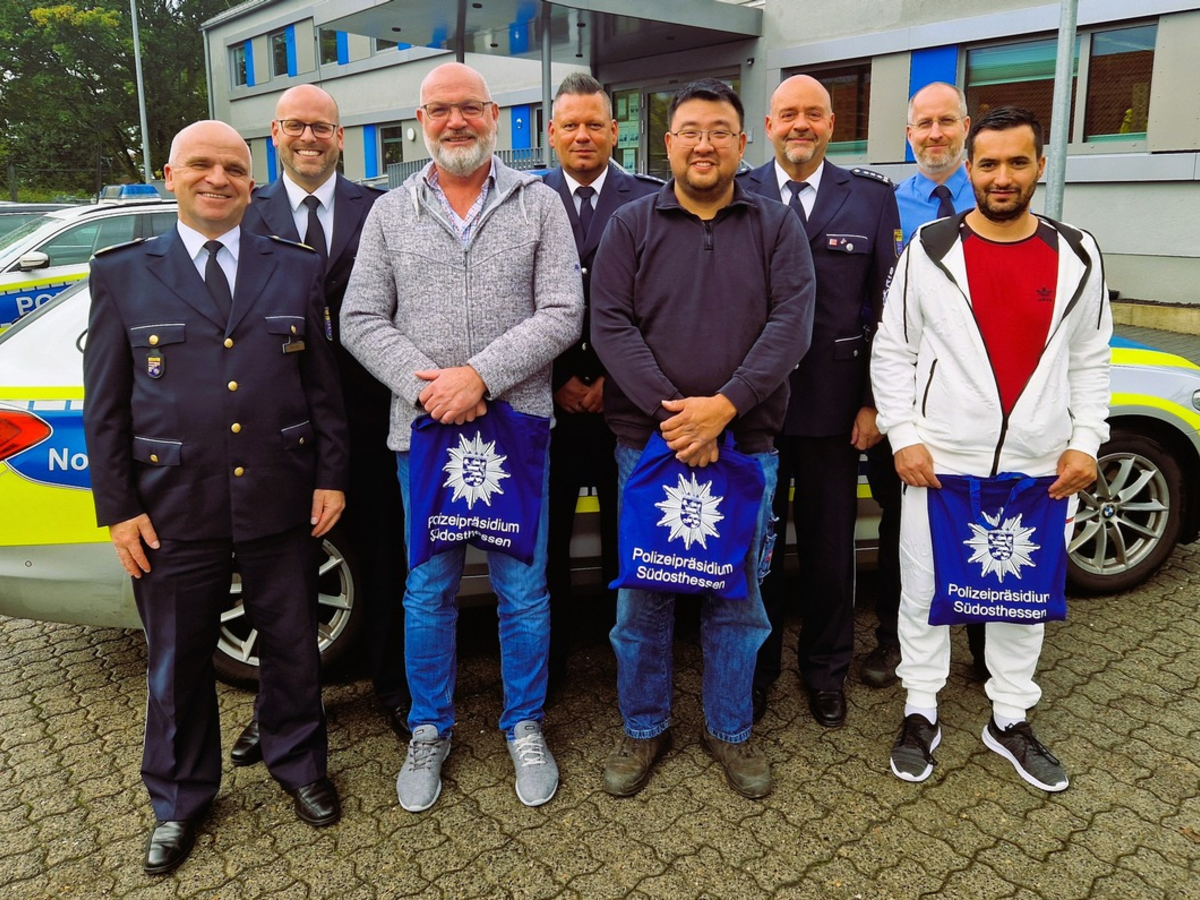Um den drei Zeugen für ihr vorbildliches und selbstloses Einschreiten, das passenderweise am "Tag der Zivilcourage" stattfand, zu danken und ihr Handeln zu würdigen, wurden sie am heutigen Donnerstag (10. Oktober) nach Langenselbold eingeladen. In der dortigen Polizeiautobahnstation erhielten sie aus den Händen des Leiters der Abteilung Einsatz, Marco Weller, ein kleines Präsent als Zeichen der Anerkennung. "Ihr schnelles und beherztes Handeln hat entscheidend dazu beigetragen, dass in dieser Situation Schlimmeres verhindert werden konnte. Wenn Sie nicht eingegriffen hätten, hätten Menschen verletzt werden können oder es wäre möglicherweise noch schlimmer ausgegangen. Ihr Eingreifen im richtigen Moment war alles andere als selbstverständlich. Dass letztendlich nichts Schlimmes passiert ist, verdanken wir Ihrem mutigen Einsatz", resümierte der Abteilungsdirektor, der sich unter anderem zusammen mit Etienne Schmitt (Leiter der Direktion Verkehrssicherheit / Sonderdienste) und Christian Kreß (Leiter der Polizeiautobahnstation Langenselbold) nochmals eindrücklich den Geschehensablauf durch die Zeugen schildern ließ.