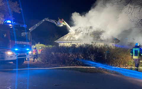 13.11.2023 - 10:20:29 | presseportal.deBei Eintreffen der Feuerwehr Fintel stand ein Wintergarten in Vollbrand. Die Flammen waren bereits auf den Dachstuhl des Wohnhauses übergegriffen. Die vier Bewohner hatten sich glücklicherweise selbst aus dem Gebäude befreit. Umgehend wurden weitere Feuerwehrkräfte aus Lauenbrück, Rotenburg und Vahlde nachalarmiert. Darunter auch eine Drehleiter. Mit mehreren C-Rohren gingen die Einsatzkräfte gegen die Flammen vor. Ein innenangriff war aufgrund von Einsturzgefahr nicht mehr möglich. Da sich der Brand schon in den Dachstuhl des Wohnhauses ausgebreitet hatte, musste die Dachhaut über die Drehleiter geöffnet werden, um das Feuer abzulöschen. Schwierigkeit war, beim Öffnen fachten die Flammen immer wieder an. Parallel musste eine Wasserversorgung über längere Wegstrecke bim dem Scheeßeler Schlauchwagen hergestellt werden. Im späteren Verlauf war es notwendig den Dachstuhl mit einem Bagger einzureißen.